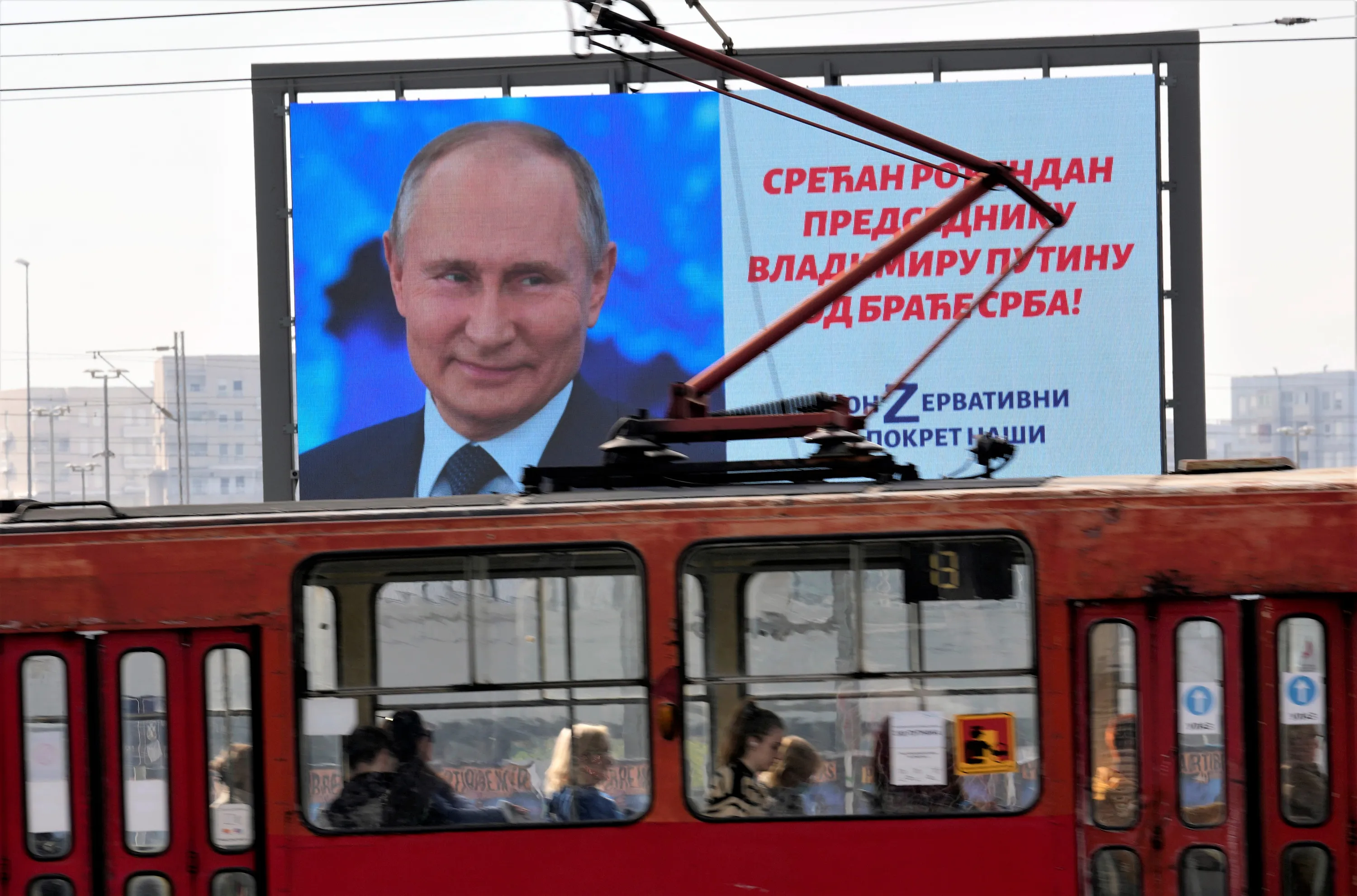 People look through the tram windows as they pass a big screen showing Russian President Vladimir Putin and reading: “Happy birthday to President Vladimir Putin from the Serb brethren!”, in Belgrade, Serbia, Friday, Ocober. 7, 2022. The posters are signed by a Pro-Russian right-wing group. Putin remains popular in Serbia despite the attack on Ukraine, and many in the Balkan country believe that the Russian president was provoked by the West into launching the invasion. (Photo by Darko Vojinovic/AP Photo)