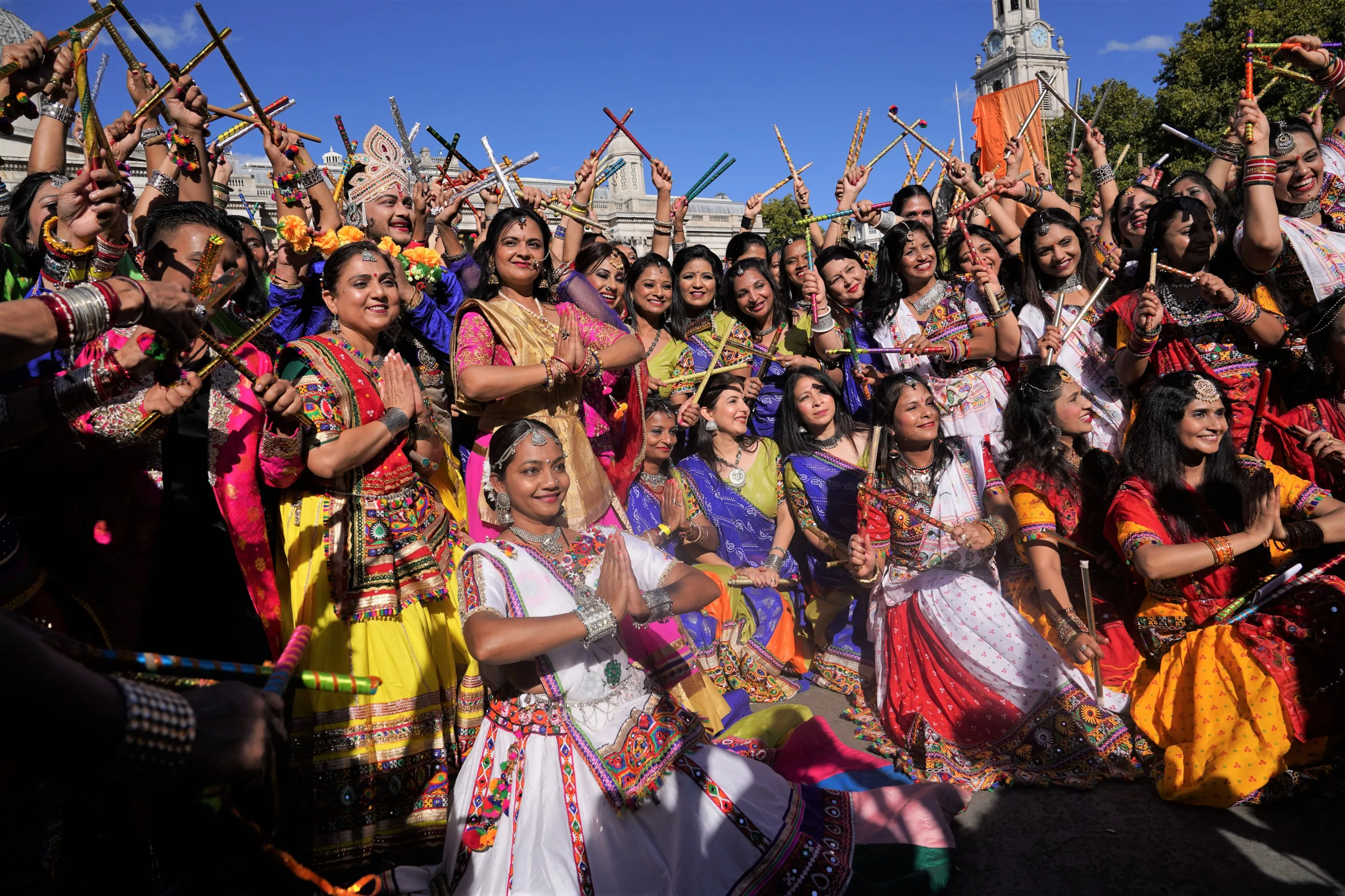 Dancers perform during the Diwali on the Square celebration, in Trafalgar Square, London on Sunday, October 9, 2022. (Photo by Yui Mok/PA Images via Getty Images)