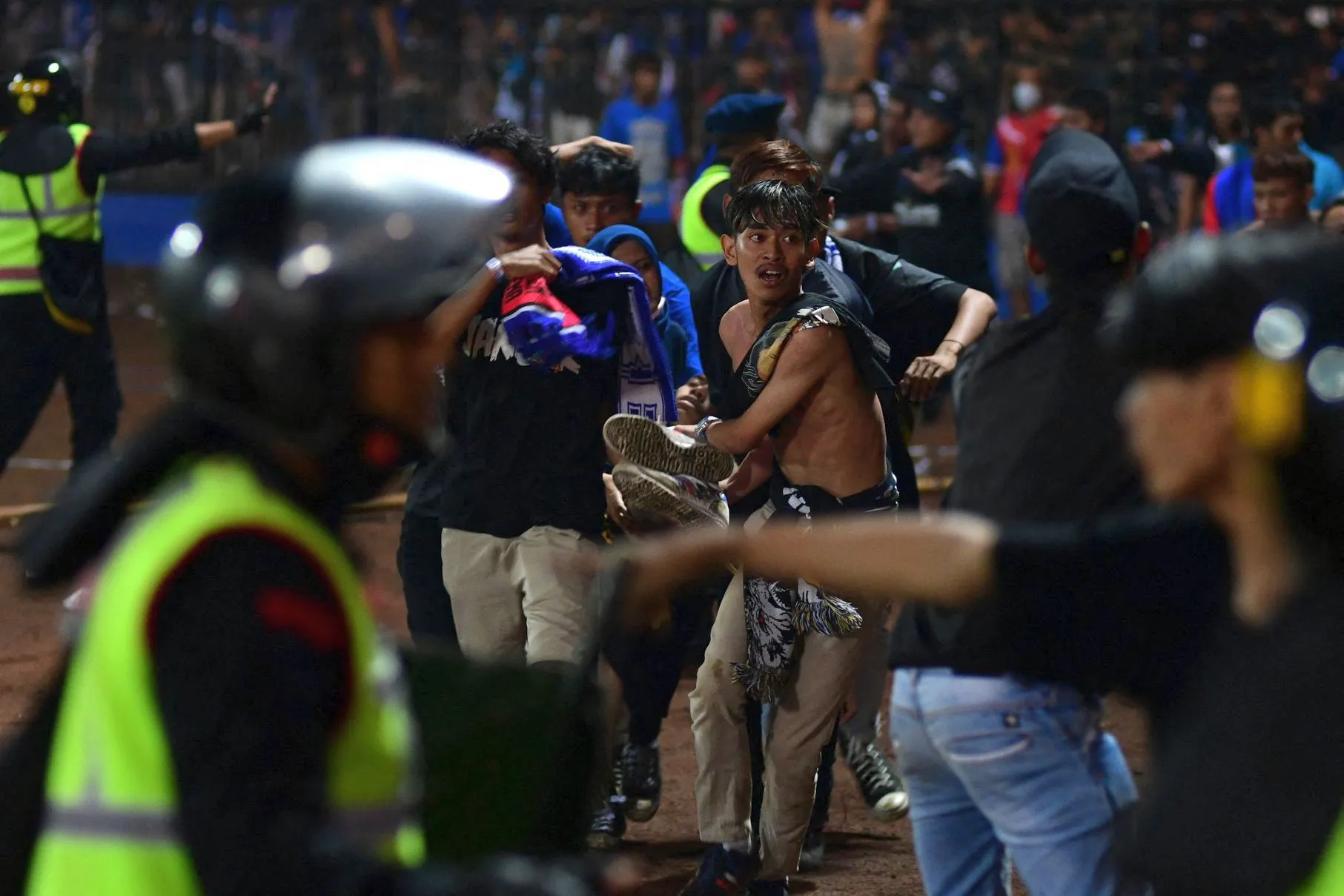 In this picture taken on October 1, 2022, a group of people carry a man at Kanjuruhan stadium in Malang, East Java. At least 127 people died at a football stadium in Indonesia late on October 1 when fans invaded the pitch and police responded with tear gas, triggering a stampede, officials said. (Photo by AFP Photo/Stringer)