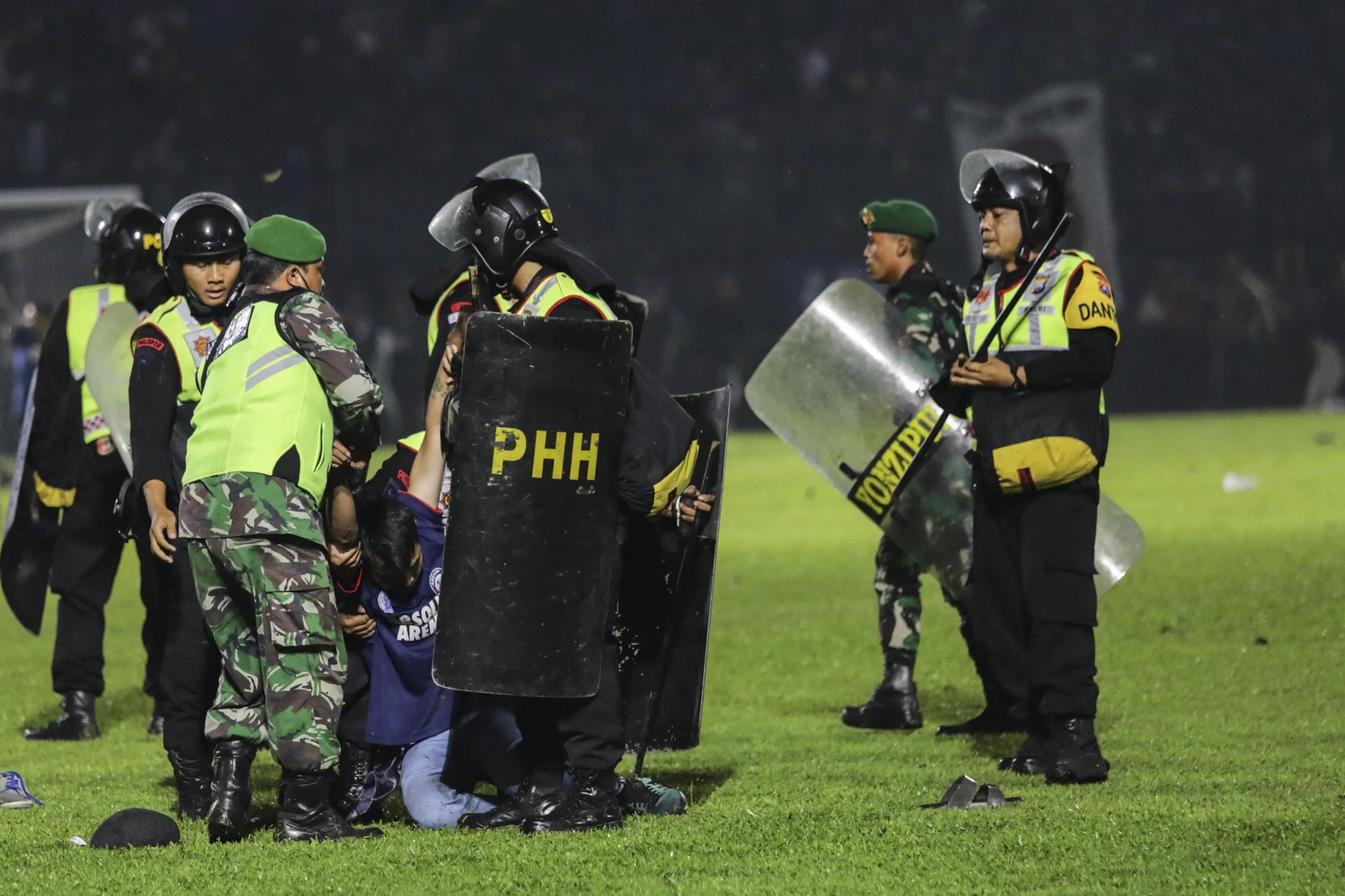 Police officers arrest a fan on the pitch during a clash between fans at Kanjuruhan Stadium in Malang, East Java, Indonesia 02 October 2022. At least 127 people including police officers were killed mostly in stampedes after a clash between fans of two Indonesian soccer teams, according to the police. (Photo by H. Prabowo/EPA/EFE)