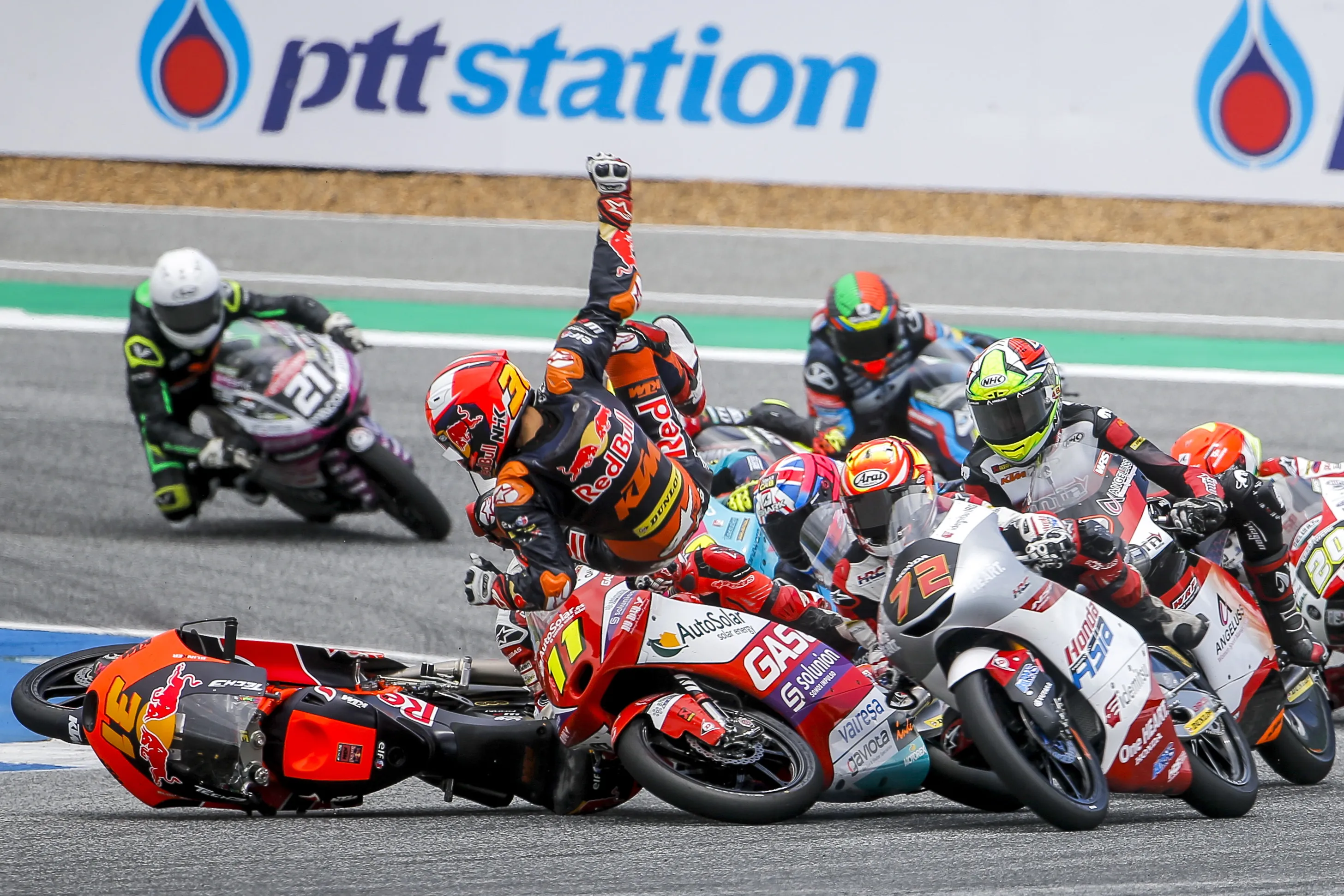 Mexican Moto3 rider Adrian Fernandez of Tech 3 is ejected from his bike as he crashed at the start of the Moto3 race during the Motorcycling Grand Prix of Thailand at Chang International Circuit, Buriram province, Thailand, 02 October 2022. (Photo by Diego Azubel/EPA/EFE)