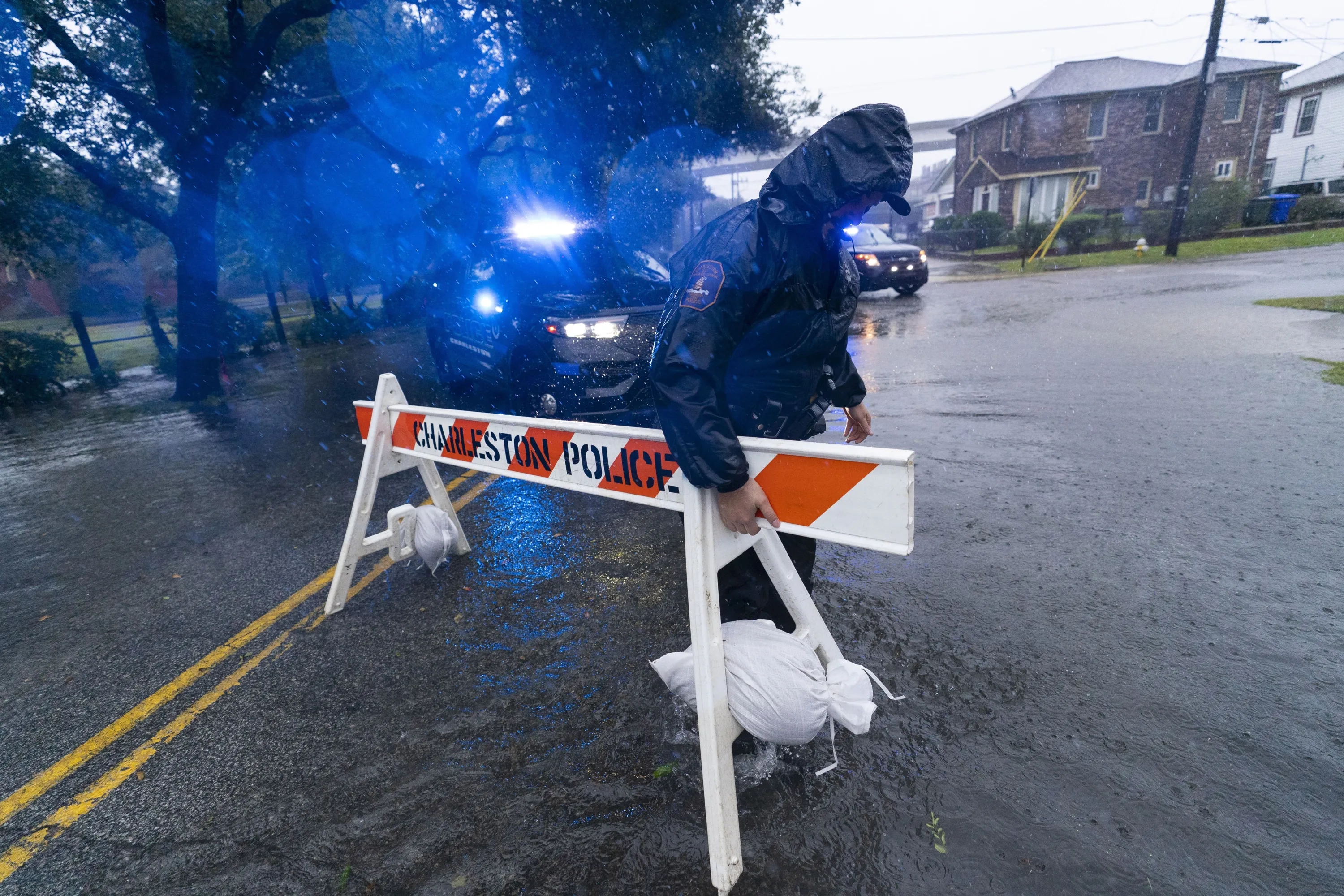 A Charleston police officer moves a barricade to block a flooded street as the effects from Hurricane Ian are felt, Friday, September 30, 2022, in Charleston, S.C. (Photo by Alex Brandon/AP Photo)