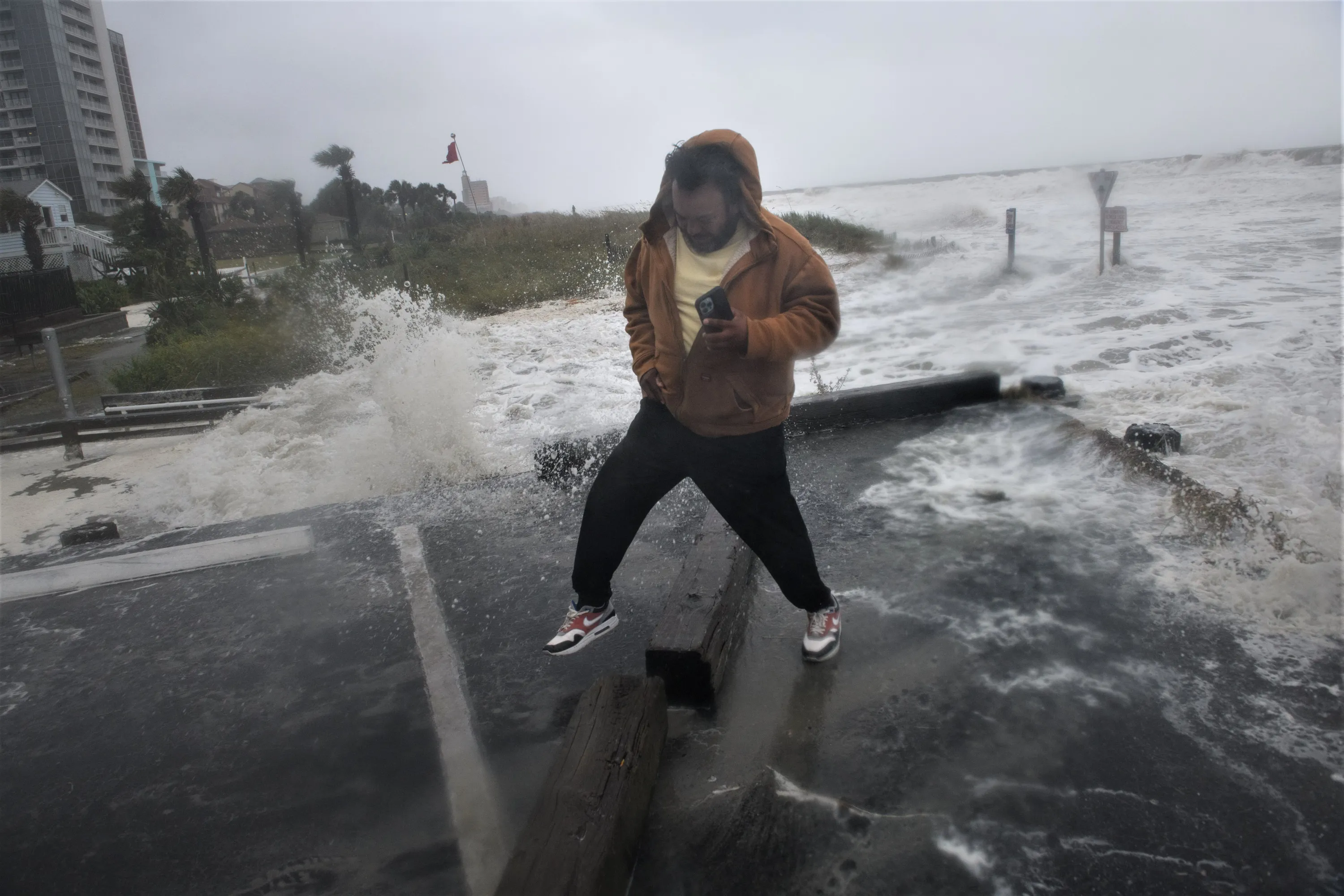 John Ramirez reacts to water splashing toward him as Hurricane Ian effects the coast in Myrtle Beach, SC on September 30, 2022. (Photo by Melissa Sue Gerrits for The Washington Post)