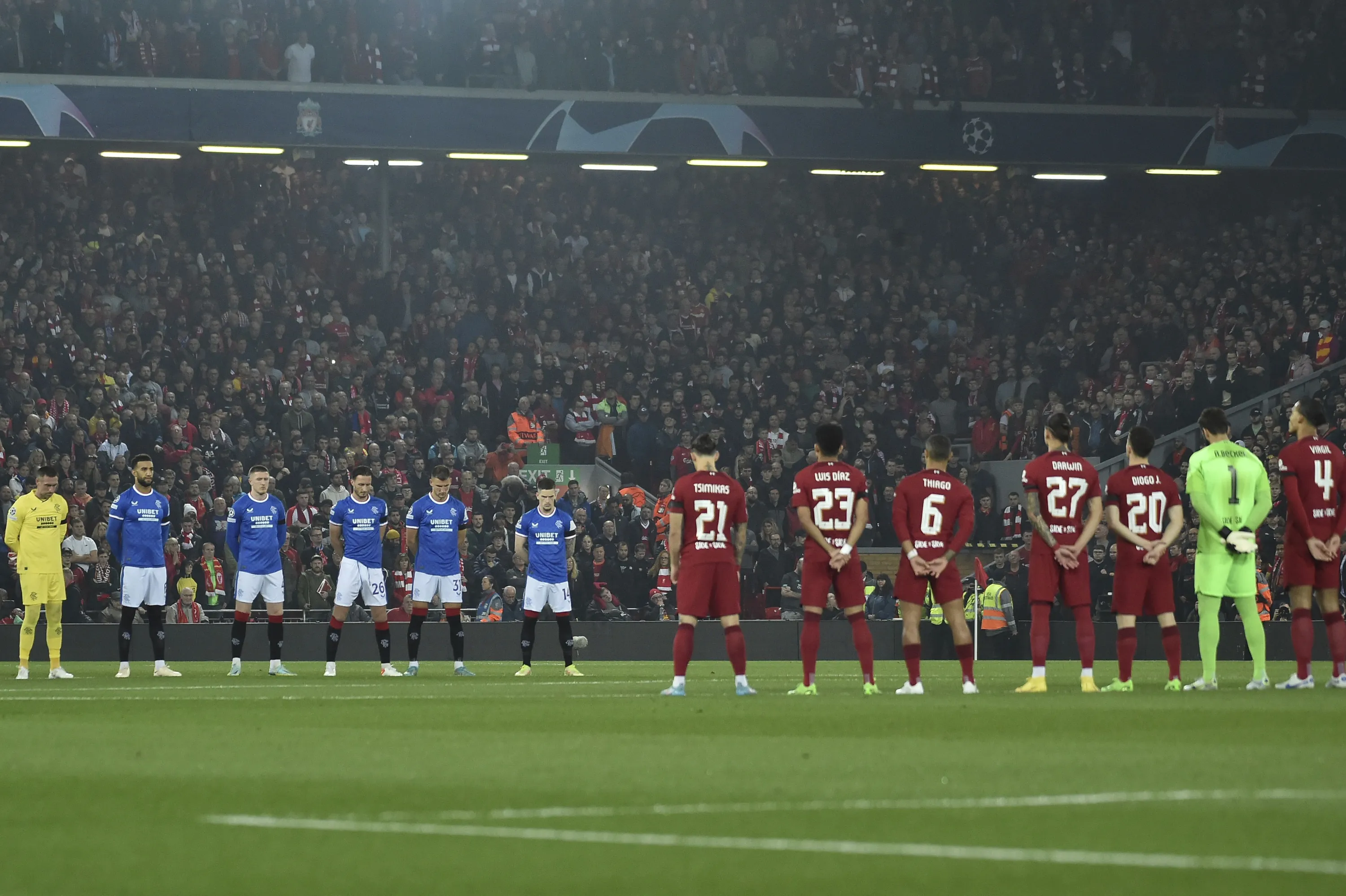 Players observe a minute of silence, in the memory of the fatal victims of a stampede during a soccer match in Indonesia, before the Champions League Group A soccer match between Liverpool and Rangers at Anfield stadium in Liverpool, England, Tuesday October 4, 2022. (Photo by Rui Vieira/AP Photo)