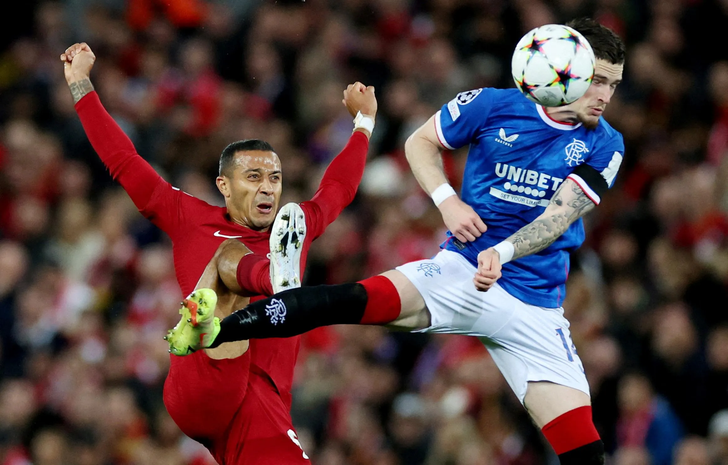 Thiago Alcántara of Liverpool (L) defends the ball from Ryan Kent of Rangers (R) during the UEFA Champions League group A match between Liverpool FC and Rangers FC at Anfield on October 4, 2022 in Liverpool, United Kingdom. (Photo by Phil Noble/Reuters)