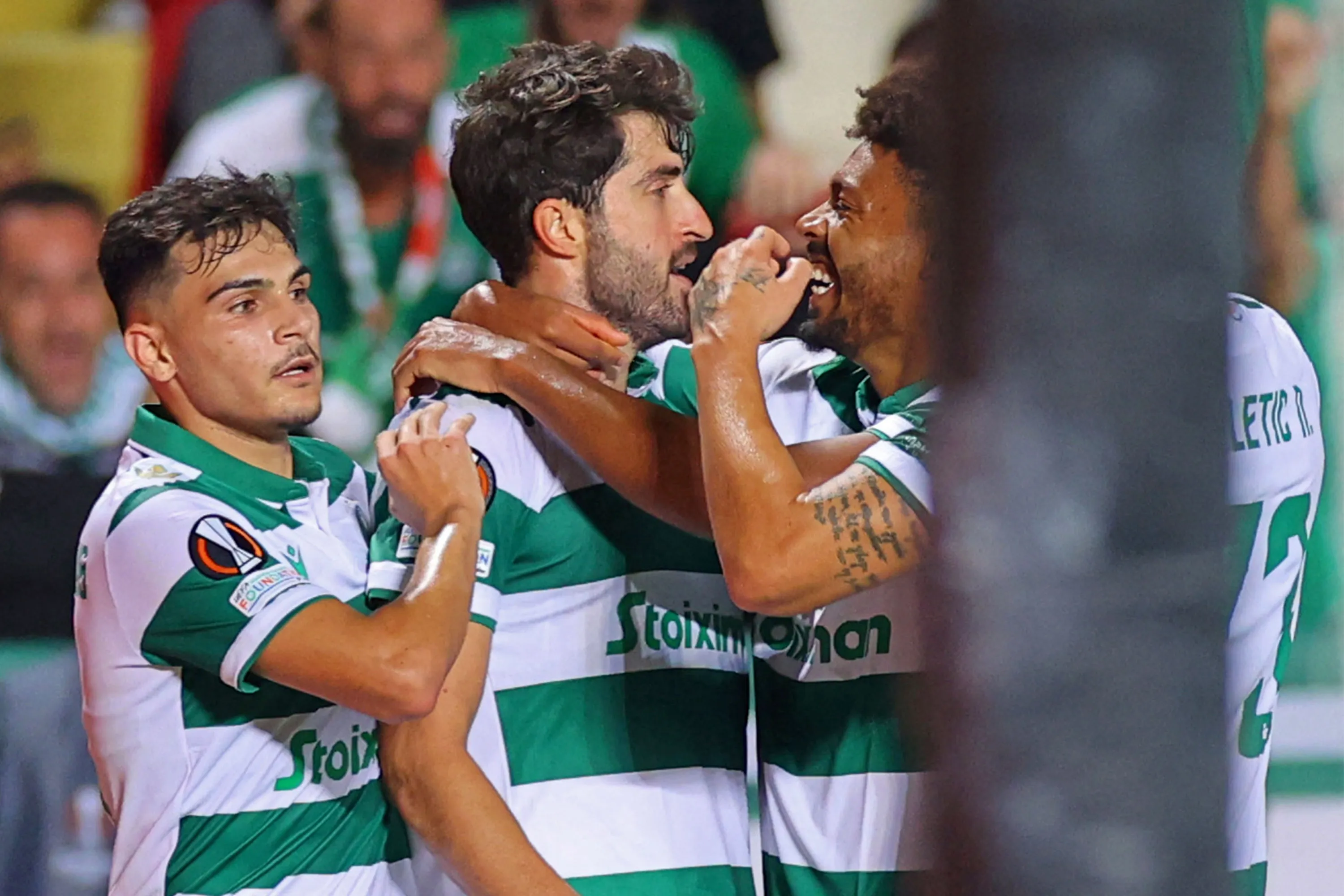 Omonia's Iranian forward Karim Ansarifard (C) is congratulated by his teammates after scoring a goal during the UEFA Europa League group E football match between Cyprus' Omonia Nicosia and England's Manchester United at GSP stadium in the capital Nicosia on October 6, 2022. (Photo by AFP Photo/Stringer)