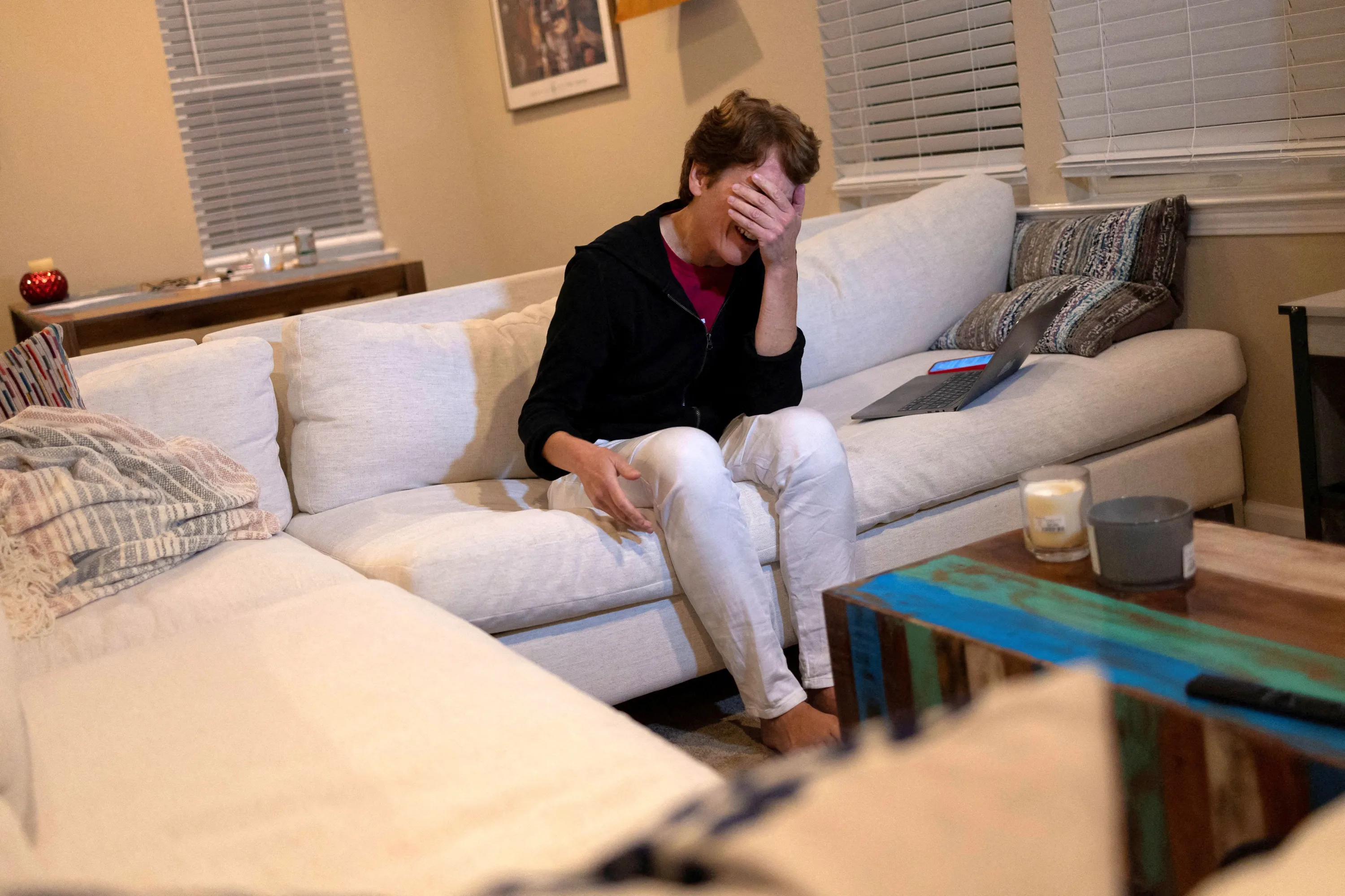 Scientist Carolyn Bertozzi reacts at her home after winning one of three Nobel Prize in Chemistry, in Palo Alto, California, U.S. October 5, 2022. (Photo by Carlos Barria/Reuters)
