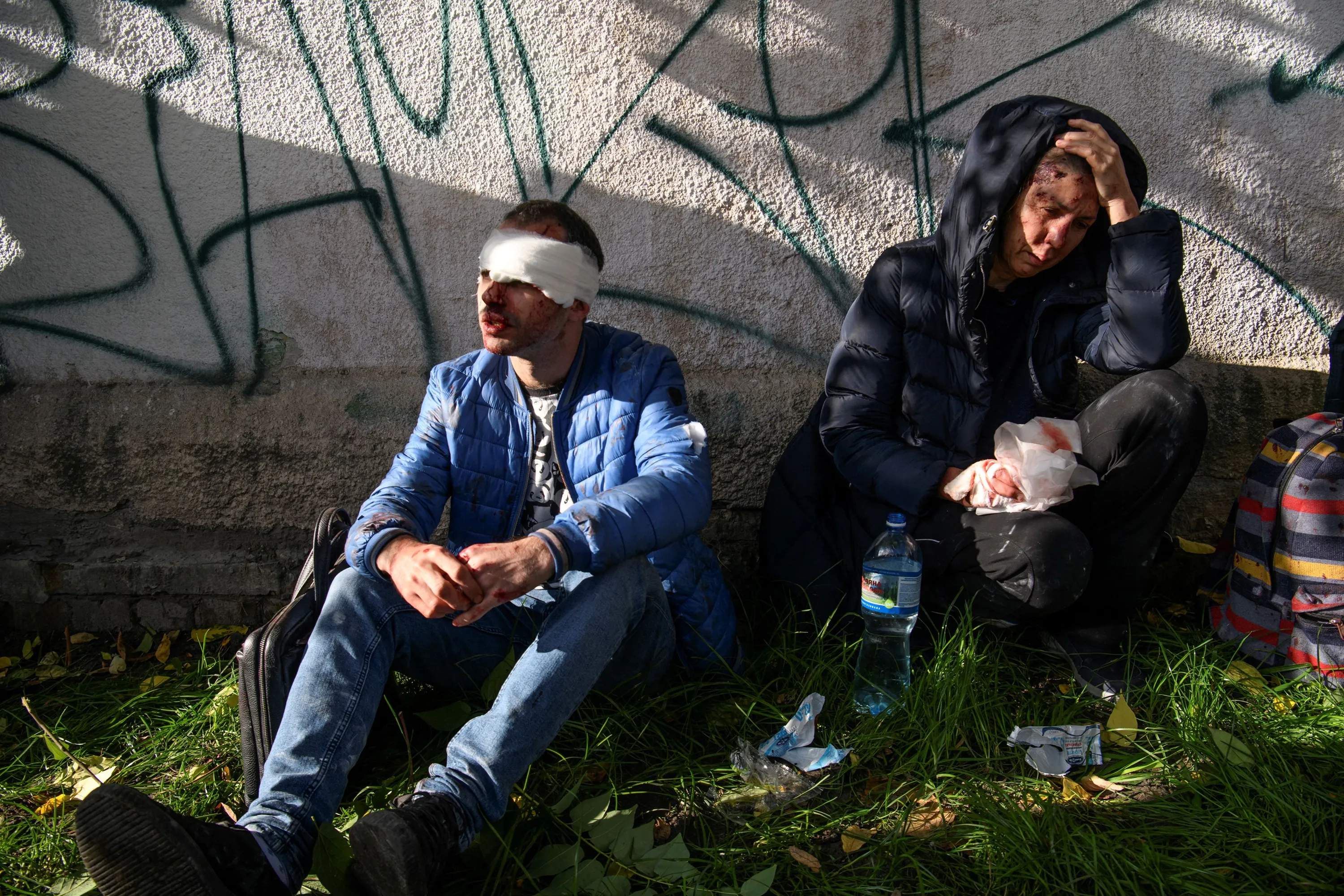Injured people sit near a site of a Russian missile strike, amid Russia's attack on Ukraine, in Kyiv, Ukraine on October 10, 2022. (Photo by Vladyslav Musiienko/Reuters)