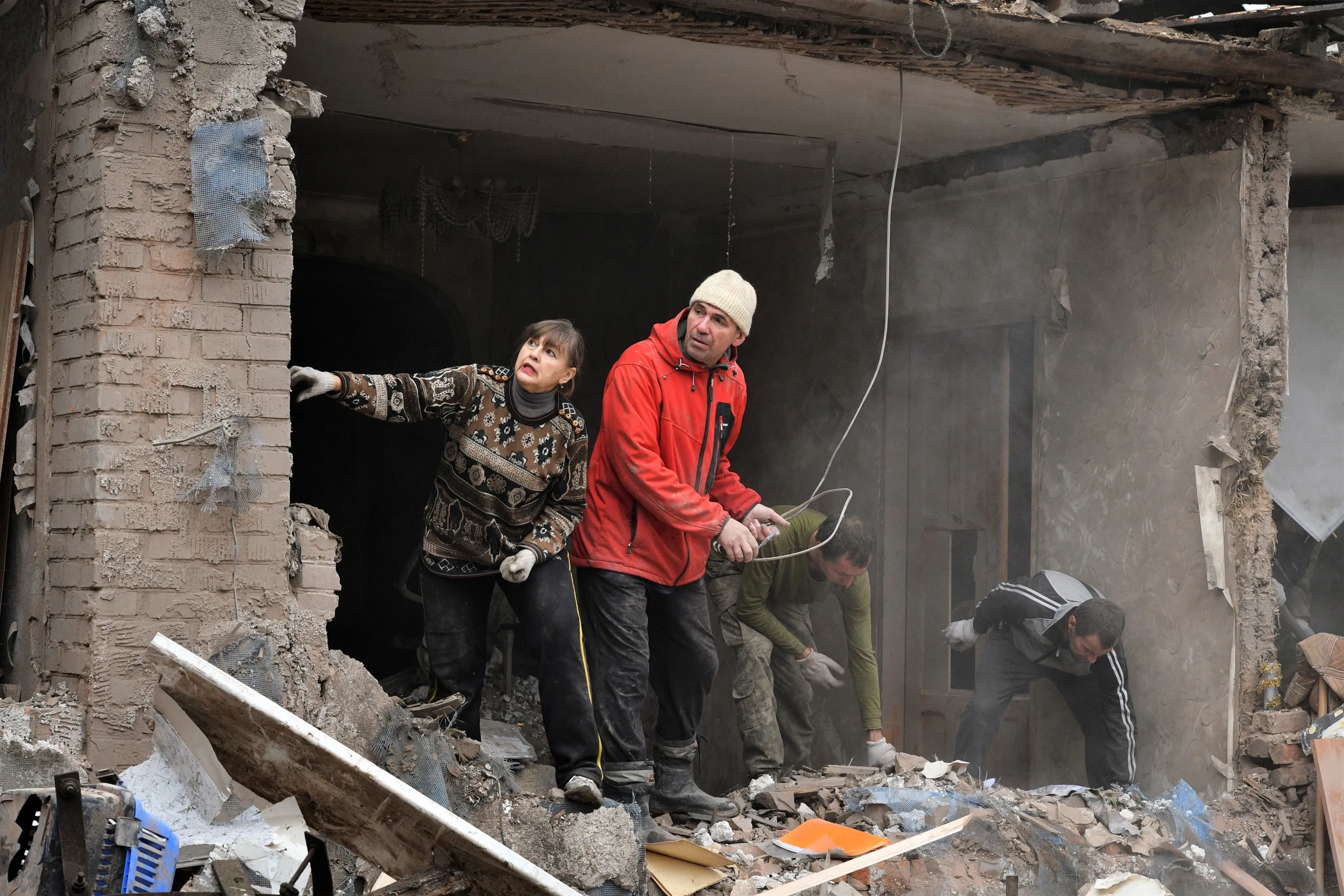 People work to remove debris from a damaged house after an overnight Russian shelling, in Sloviansk, Donetsk region, Ukraine, Monday, October 10, 2022. The Russian missiles that rained down Monday on cities across Ukraine, bringing fear and destruction to areas that had seen months of relative calm, are an escalation in Moscow's war against its neighbor. But military analysts say it’s far from clear whether the strikes mark a turning point in a war that has killed thousands of Ukrainians and sent millions fleeing from their homes. (Photo by Andriy Andriyenko/AP Photo)