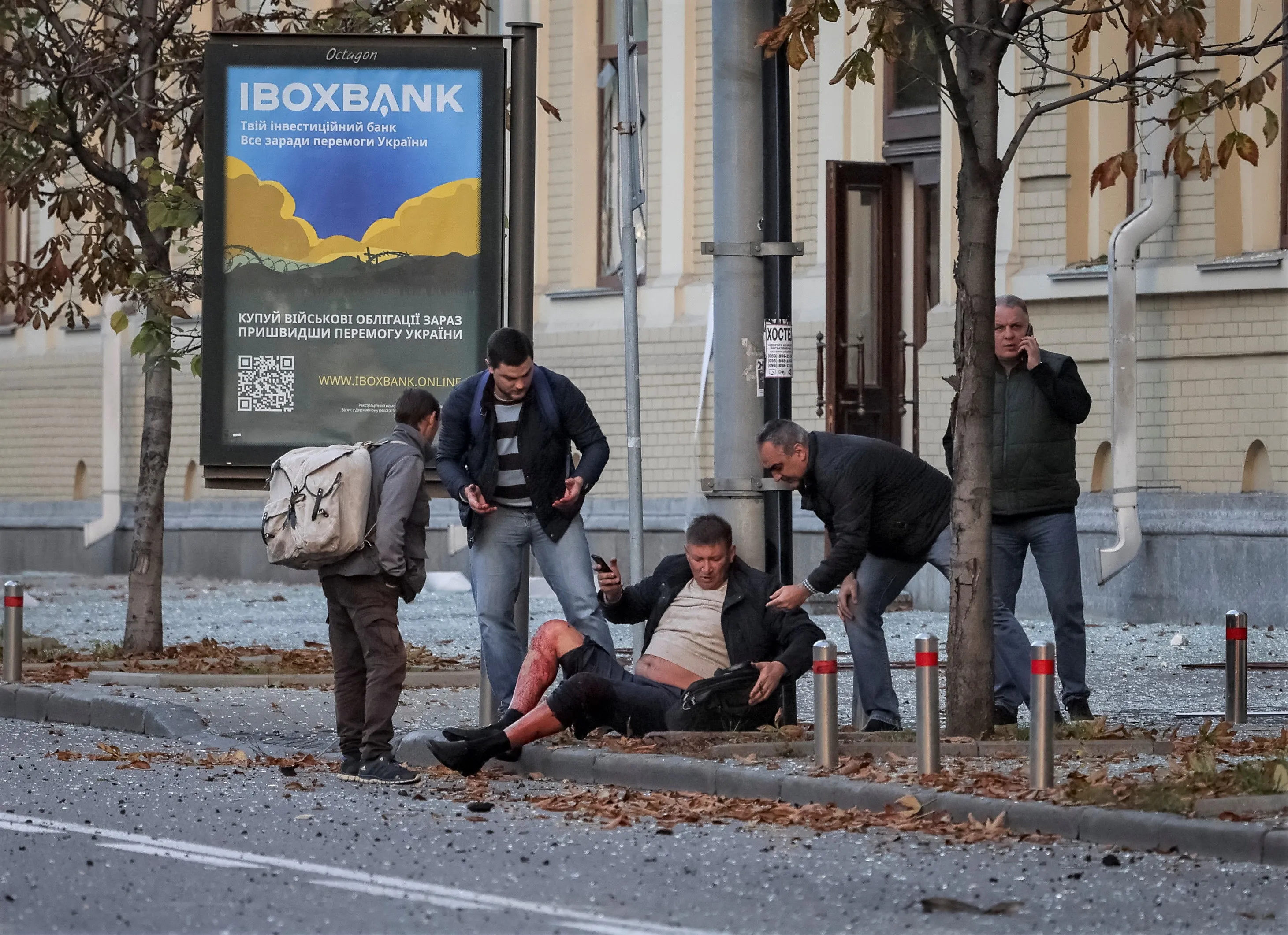 People attend a wounded man after Russian military strike, as Russia's invasion of Ukraine continues, in central Kyiv, Ukraine on October 10, 2022. (Photo by Gleb Garanich/Reuters)