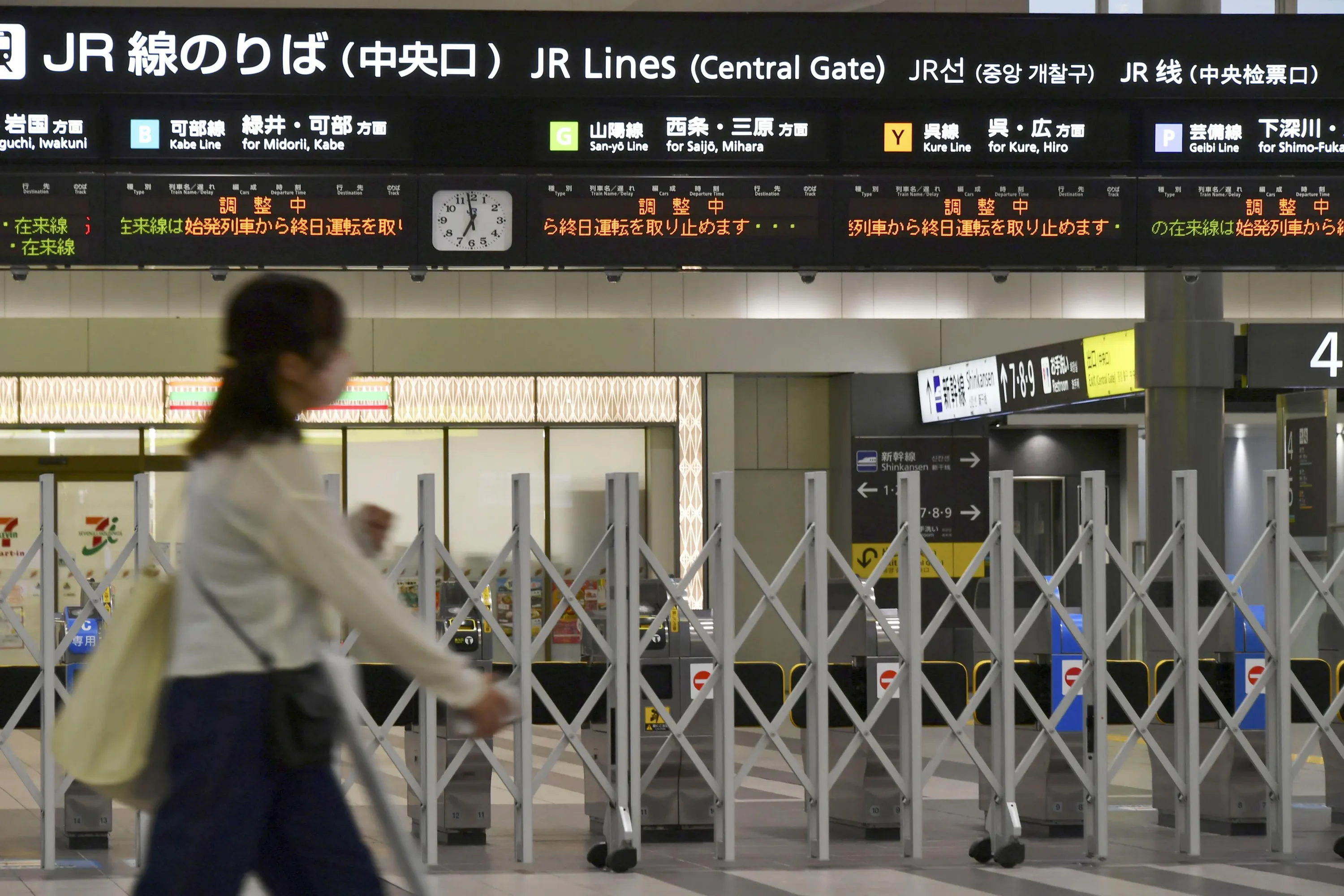 A person walks past closed ticket gates at train station in Hiroshima, western Japan, Monday September 19, 2022. Powerful Typhoon Nanmadol slammed ashore in southern Japan on Sunday as it pounded the region with strong winds and heavy rain, causing blackouts, paralyzing ground and air transportation and prompting the evacuation of thousands of people. (Photo by Kyodo News via AP Photo)