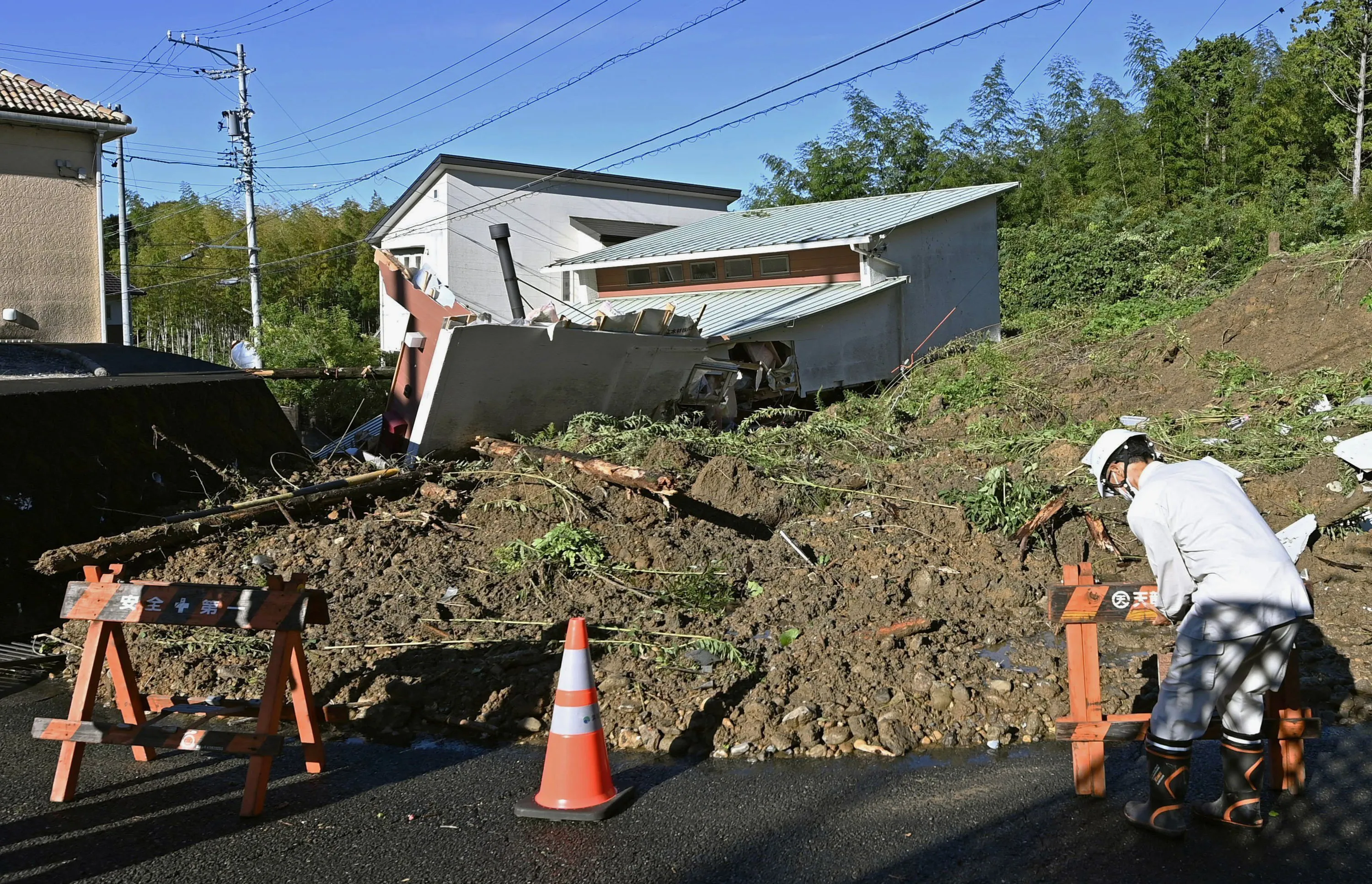 A worker places a barricade at the scene of a landslide that damaged a residential area in Hamamatsu of the Shizuoka prefecture, central Japan, Saturday, September 24, 2022. Tropical Depression Talas unleashed fierce rainfall Saturday in parts of Japan, setting off landslides, halting trains and killing a man after he crashed his car into a pond. (Photo by Mizuki Ikari/Kyodo News via AP Photo)