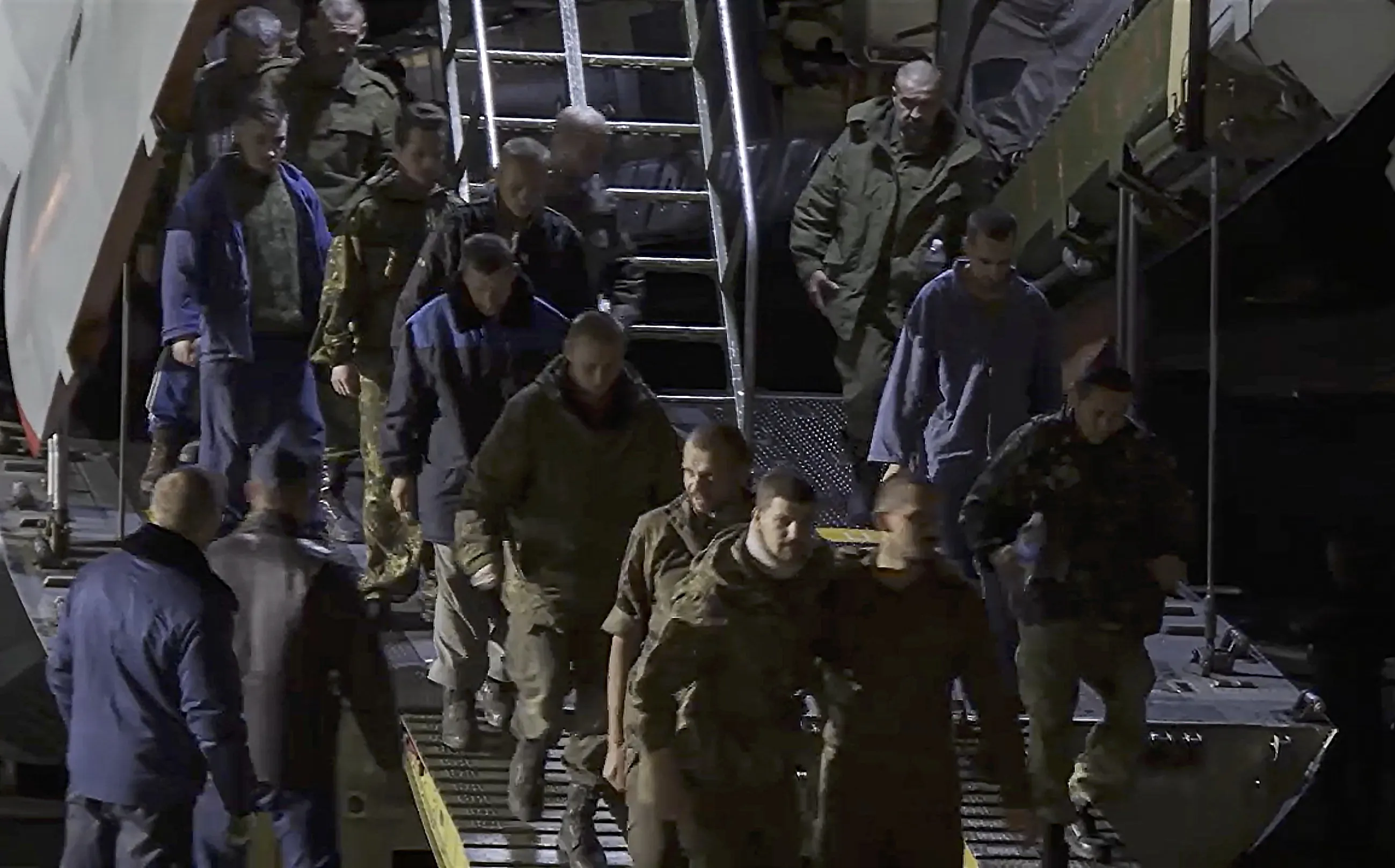 A still image taken from a handout video provided by the Russian Defence Ministry press-service shows a group of Russian prisoners of war (POW) disembarking a military aircraft after their exchange, at Chkalovsky Air Base near Moscow, Russia, 22 September 2022. Russia's Defence Ministry announced that 55 servicemen of the Armed Forces of the Russian Federation, the self-proclaimed Donetsk and Lugansk republics were released in a prisoner exchange with Ukraine. (Photo by Russian Defence Ministry Press Service/EPA/EFE)