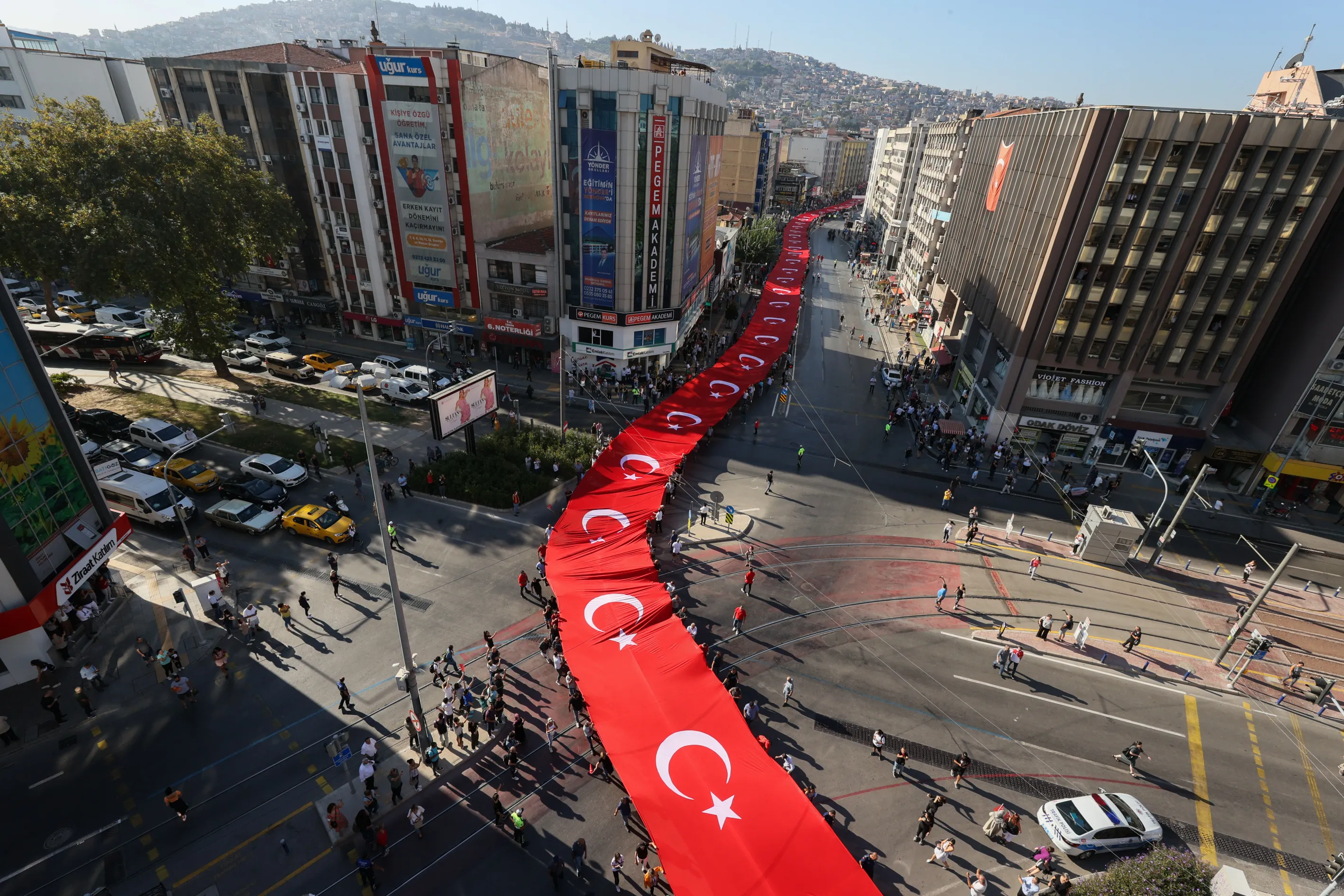 People carry 350 meters long giant Turkish flag during the Victory Parade within the 100th Independence day of Izmir, on September 09, 2022 in Izmir, Turkiye. (Photo by Mehmet Emin Menguarslan/Anadolu Agency via Getty Images)