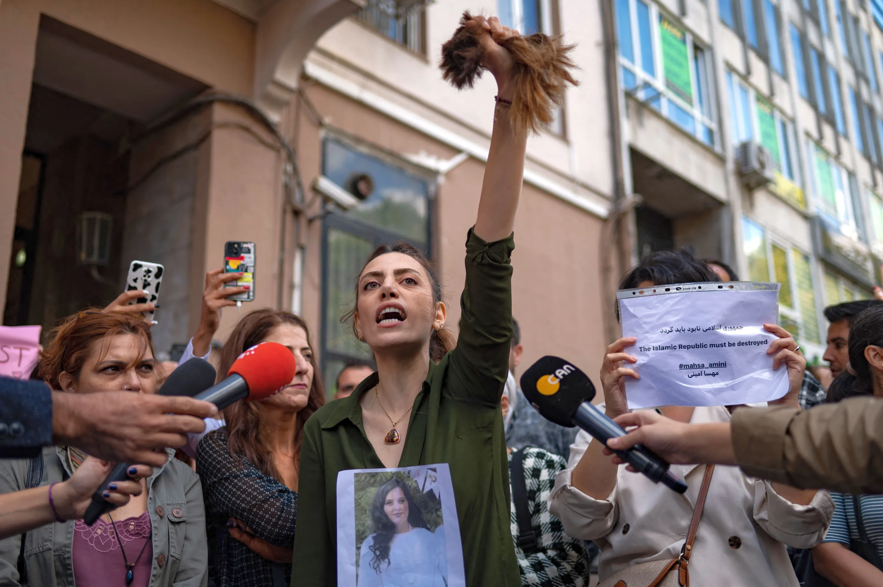 Nasibe Samsaei, an Iranian woman living in Turkey, holds up her ponytail after cutting it off with scissors, during a protest outside the Iranian consulate in Istanbul on September 21, 2022, following the death of an Iranian woman while in custody in Tehran. Mahsa Amini, 22, was on a visit with her family to the Iranian capital Tehran, when she was detained on September 13, 2022, by the police unit responsible for enforcing Iran's strict dress code for women, including the wearing of the headscarf in public. She was declared dead on September 16, 2022 by state television after having spent three days in a coma. (Photo by Yasin Akgul/AFP Photo)