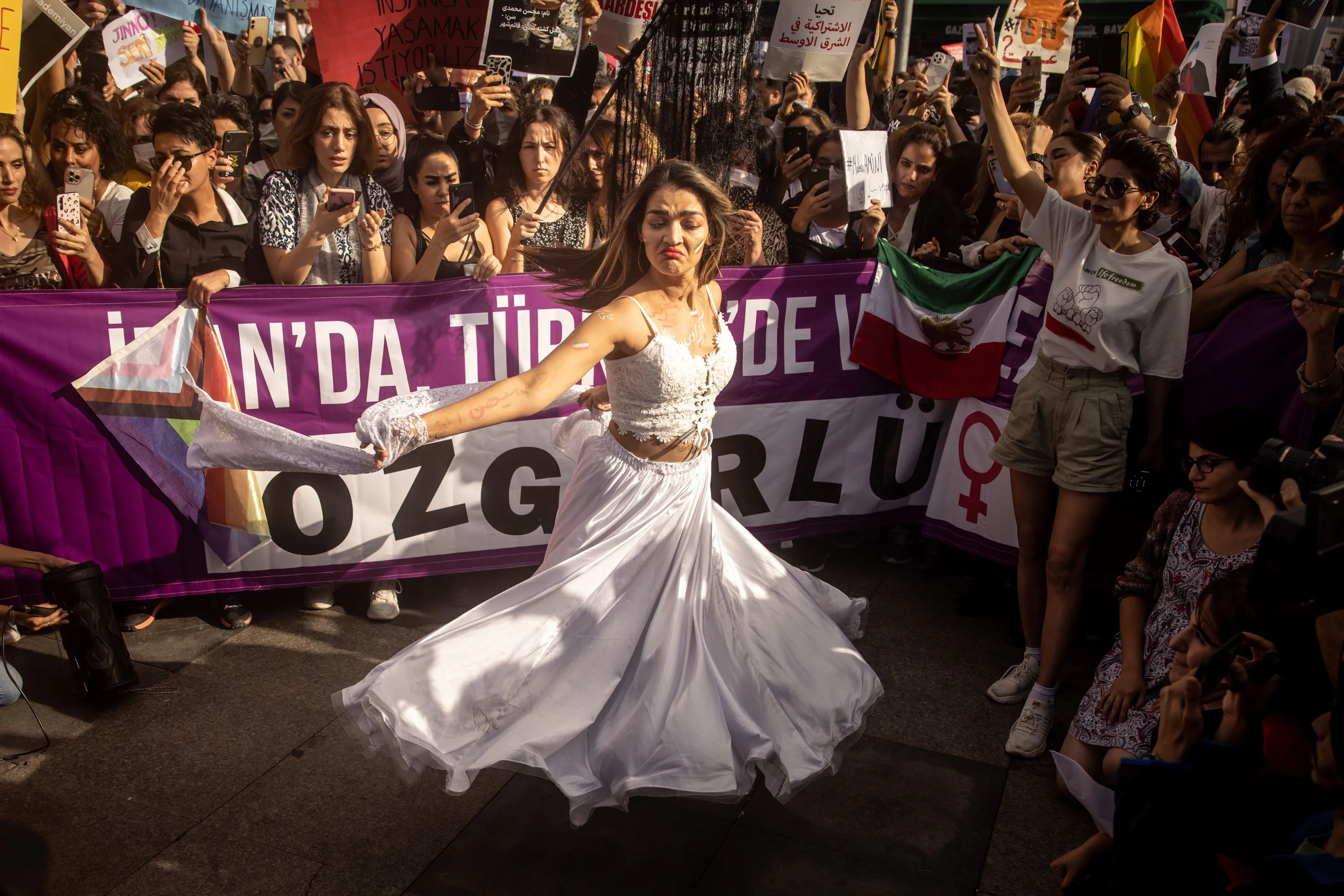 A protester takes off her head scarf while giving a performance during a protest against Iran and the death of Iranian Mahsa Amini on October 02, 2022 in Istanbul, Turkey. Mahsa Amini fell into a coma and died after being arrested in Tehran by the morality police, for allegedly violating the countries hijab rules. Amini's death has sparked weeks of violent protests across Iran. (Photo by Chris McGrath/Getty Images)