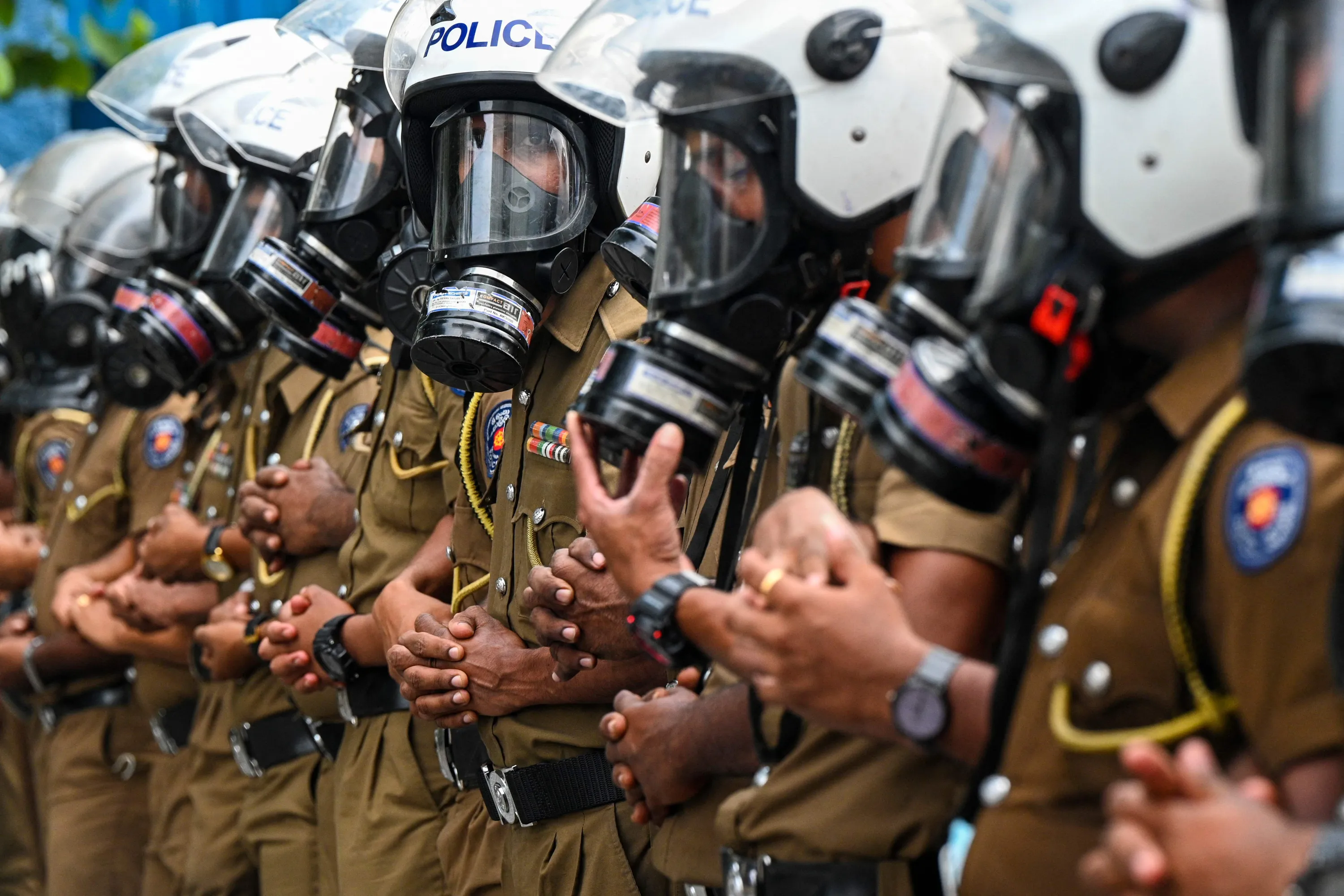 Policemen stand guard during a demonstration by the university students in Colombo on August 18, 2022. (Photo by Ishara S. Kodikara/AFP Photo)