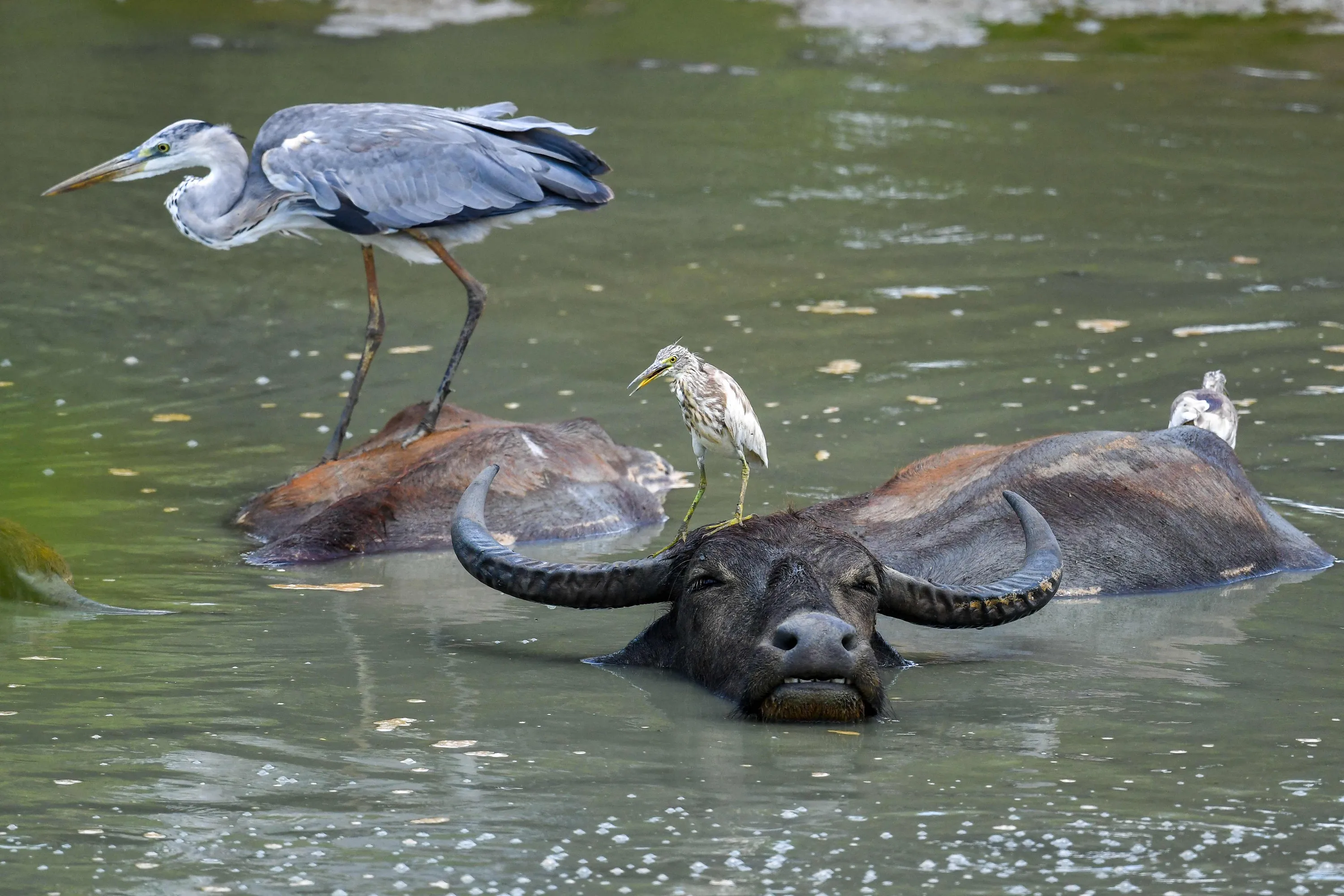 Birds sit atop Asian water buffaloes in the waters of Yala National Park in Yala on August 22, 2022. (Photo by Ishara S. Kodikara/AFP Photo)