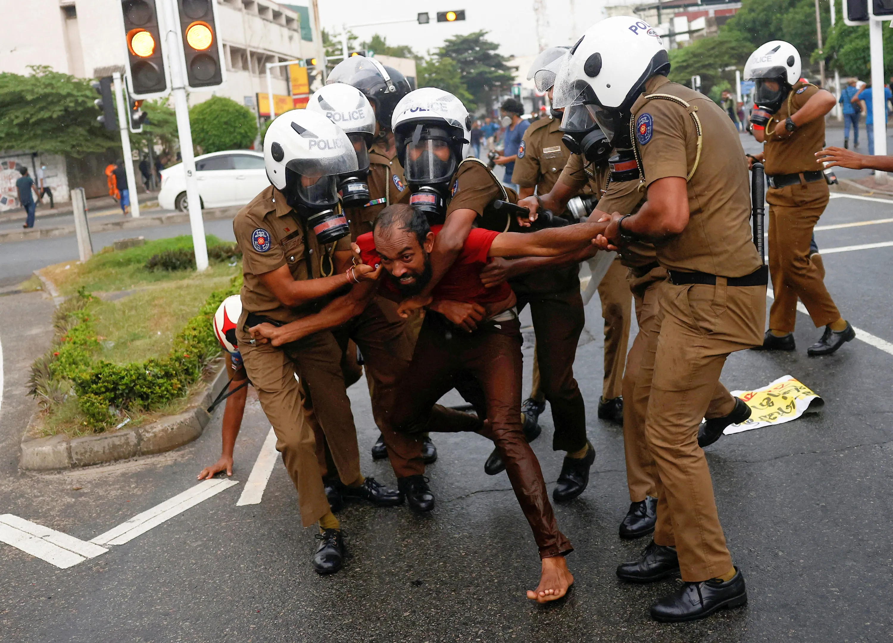 Sri Lankan police officers detain a demonstrator during an anti-government protest by Inter-University Student's Federation, amid the country's economic crisis, in Colombo, Sri Lanka on August 30, 2022. (Photo by Dinuka Liyanawatte/Reuters)