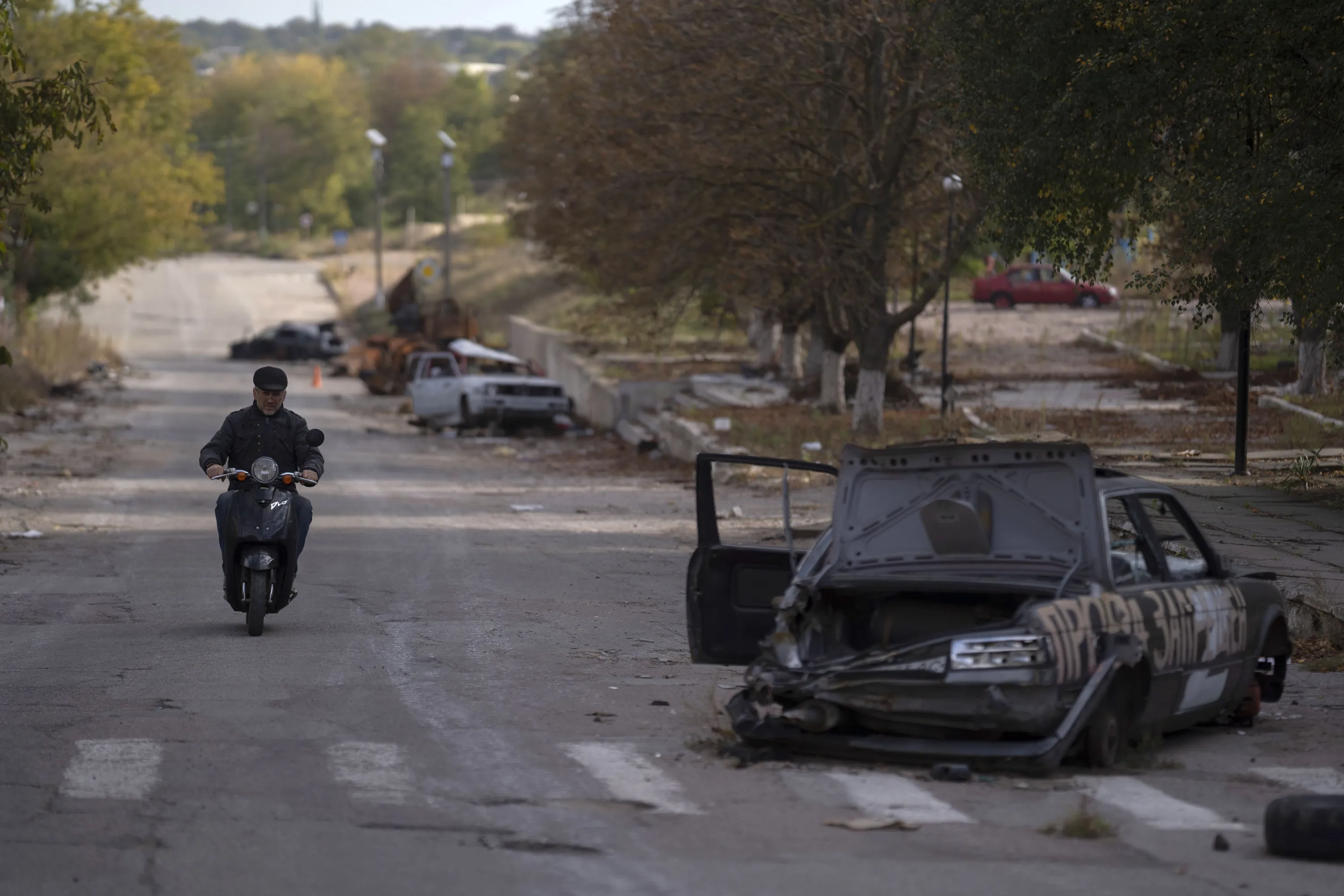 A man drives his motorcycle past destroyed cars in the retaken village of Velyka Oleksandrivka, Ukraine, Wednesday, October 12, 2022. (Photo by Leo Correa/AP Photo)