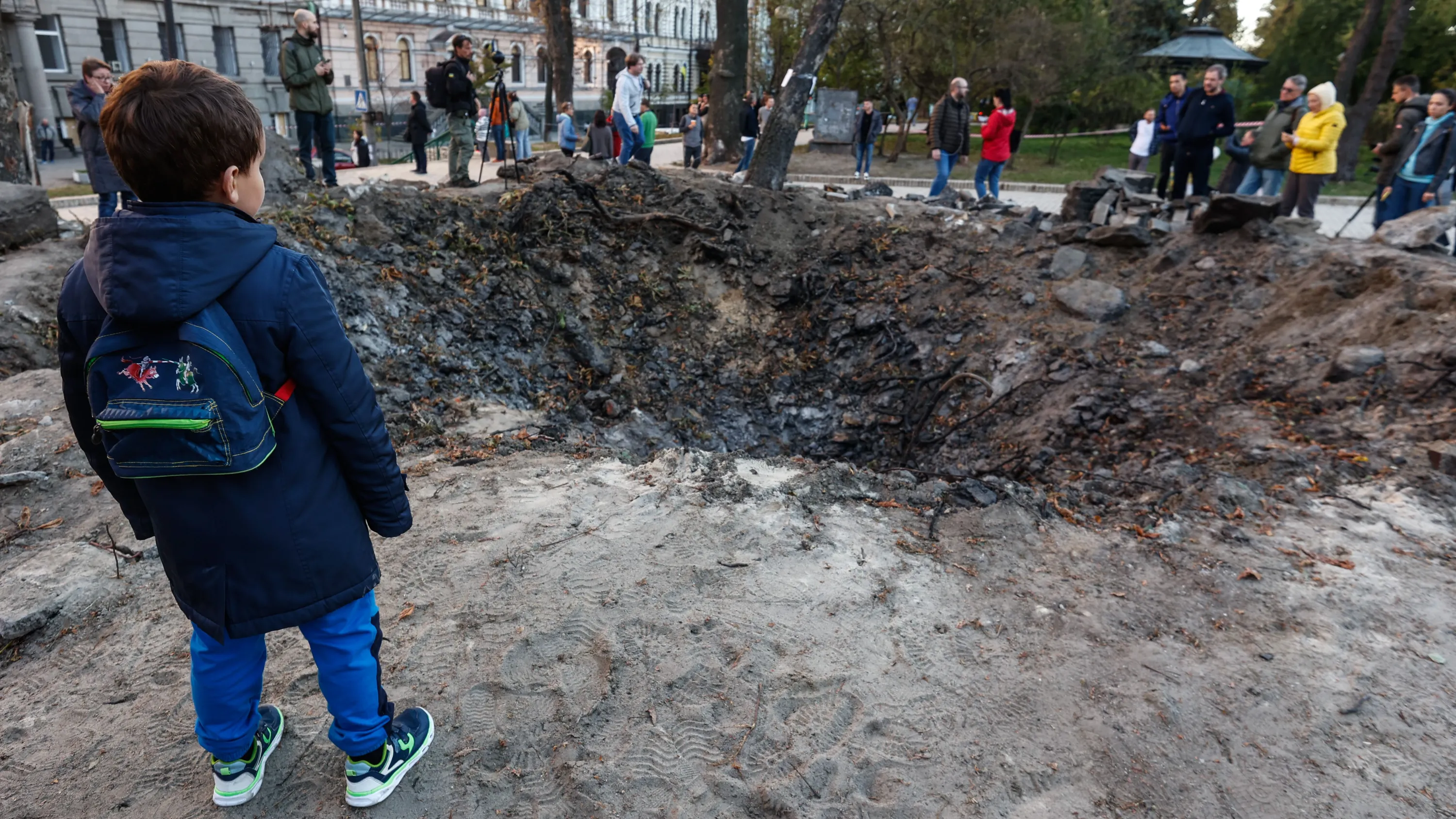 A young boy inspects a crater near a playground in Taras Shevchenko Park in Kyiv on October 12, 2022. People later left flowers in the crater in tribute to those killed during the attack. (Photo by Serhiy Nuzhnenko/Radio Free Europe/Radio Liberty)