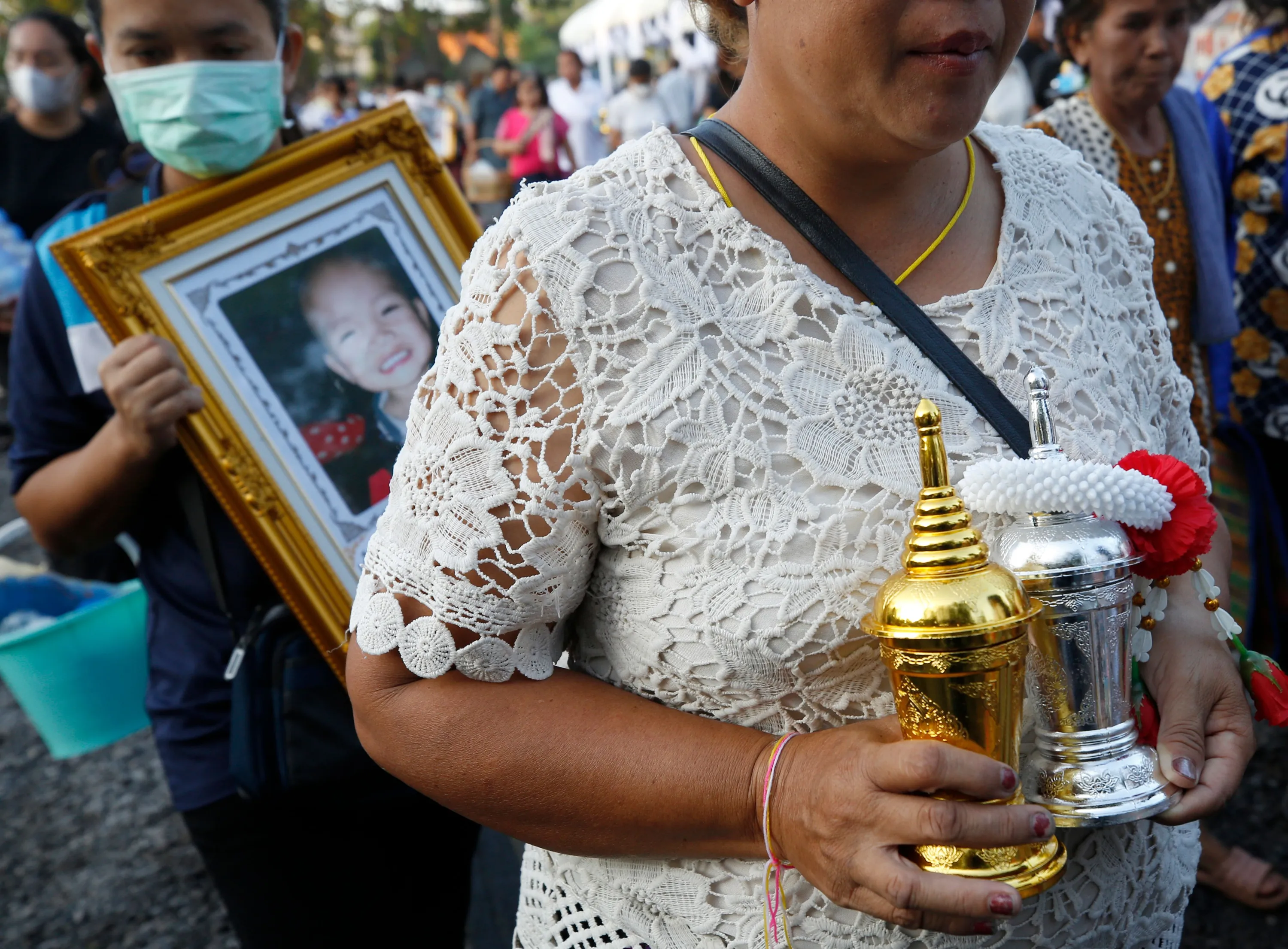 Mass shooting victims families hold cinerary urns as they collect the victims' ashes after the royal sponsored mass cremation at Wat Rat Samakkee temple in Nong Bua Lamphu province, northeastern Thailand, 12 October 2022. At least 37 people, mostly children, were killed, while another 12 people were injured, after a former policeman committed a mass shooting at a children's care center on 06 October. The gunman subsequently killed his wife and their child, then himself, police said. (Photo by Narong Sangnak/EPA/EFE/Rex Features/Shutterstock)