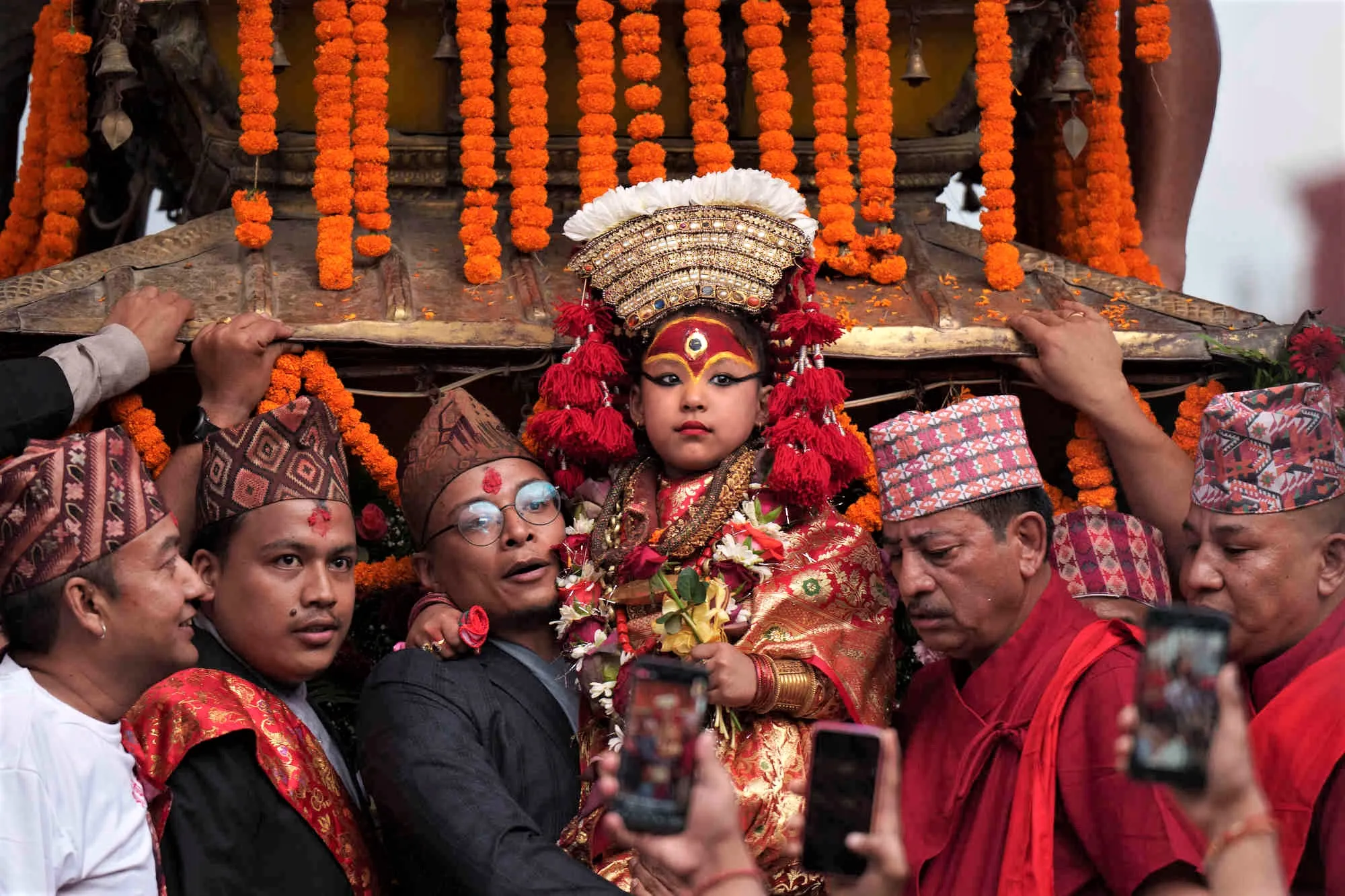 Nepal's revered living goddess Kumari is carried to be taken around in a wooden chariot during the annual Indra Jatra festival in Kathmandu, Nepal, Friday, September 9, 2022. The living goddess was pulled around the main parts of the capital Friday by devotees on a wooden chariot as tens of thousands of people lined up the old city to get a glimpse and be blessed. (Photo by Niranjan Shrestha/AP Photo)