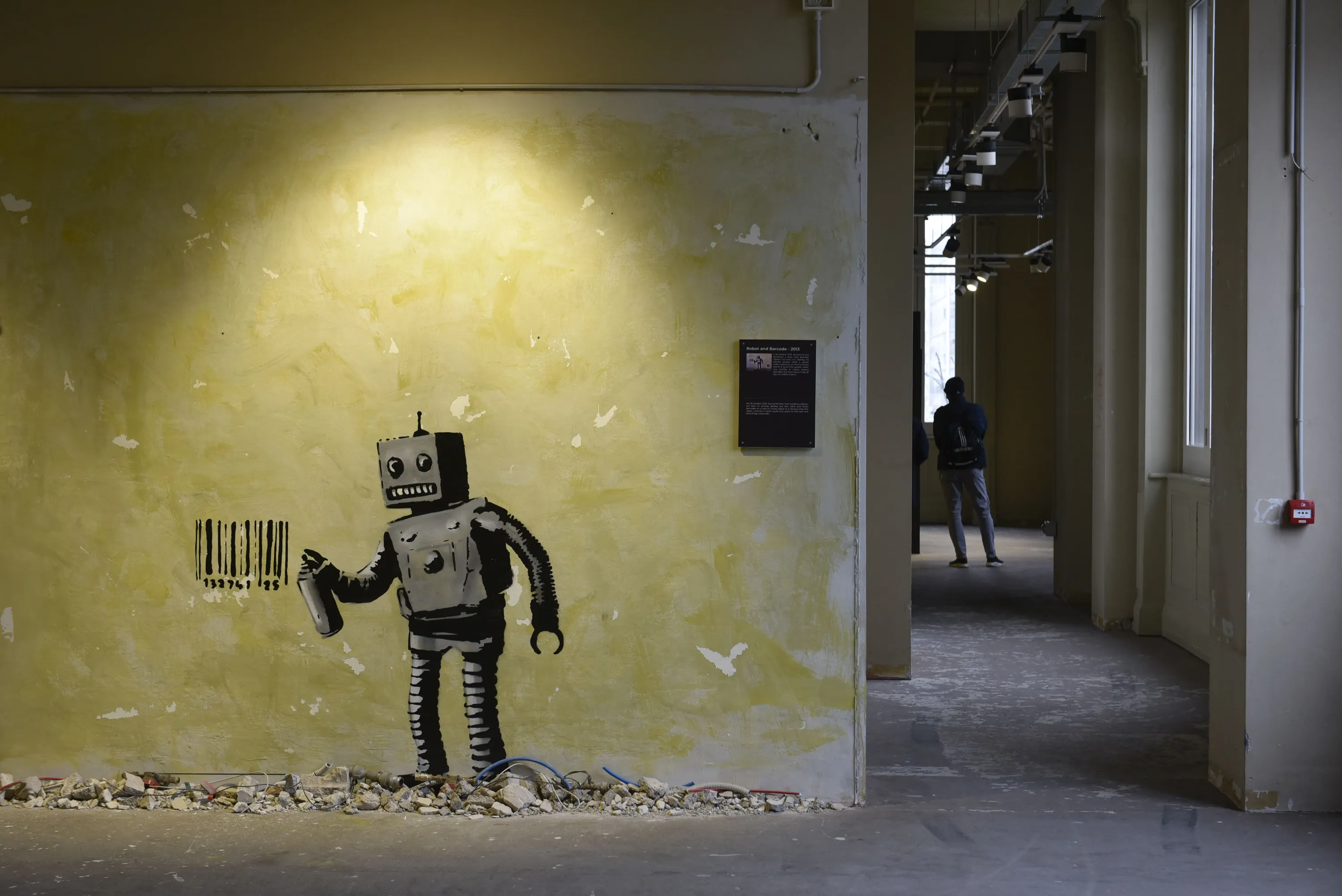 “World of Banksy”, reproductions of provocative works by the British street artist exhibited in Milan, Italy . “Robot and Barcode” is seen inside the exhibition on December 10, 2021. (Photo by Ervin Shulku/ZUMA Press Wire/Rex Features/Shutterstock)