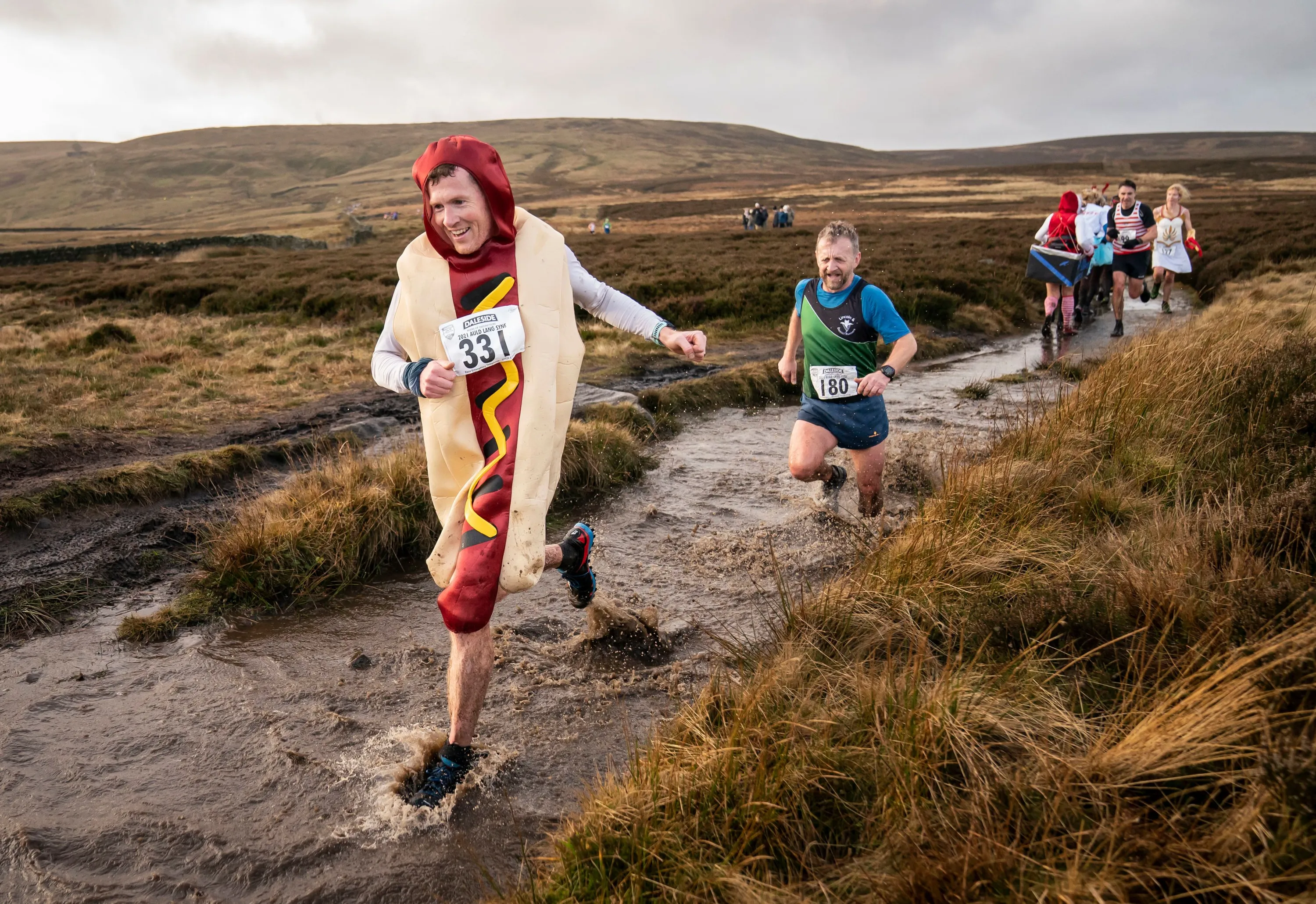 Competitors in fancy dress run across the Pennine tops near Haworth, West Yorkshire on Friday, December 31, 2021, in the annual Auld Lang Syne Fell race which attracts hundreds of runners every year. (Photo by Danny Lawson/PA Images via Getty Images)