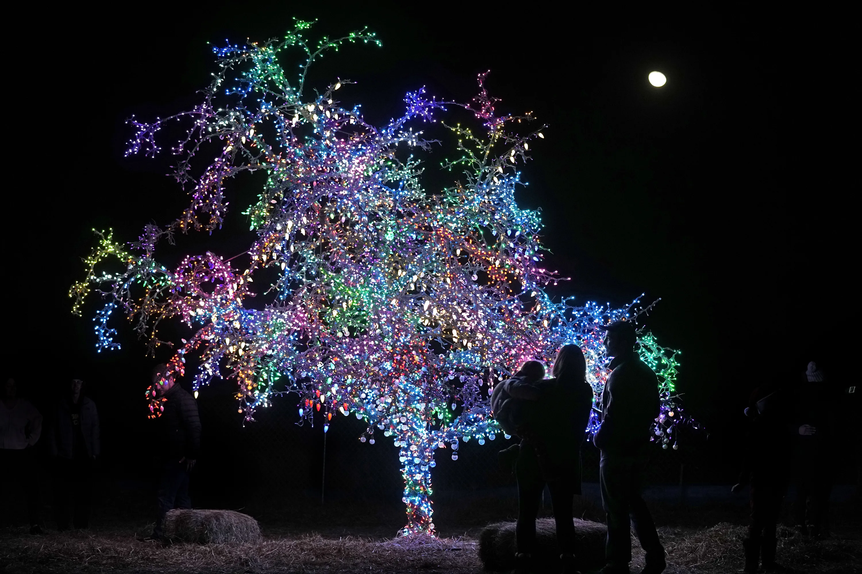 The moon rises beyond the Lee's Summit Magic Tree on Wednesday, December 22, 2021, in Lee's Summit, Mo. The lone modest tree in a field next to a freeway is covered with more than 12,000 lights and attracts thousands of visitors every Christmas season. (Photo by Charlie Riedel/AP Photo)
