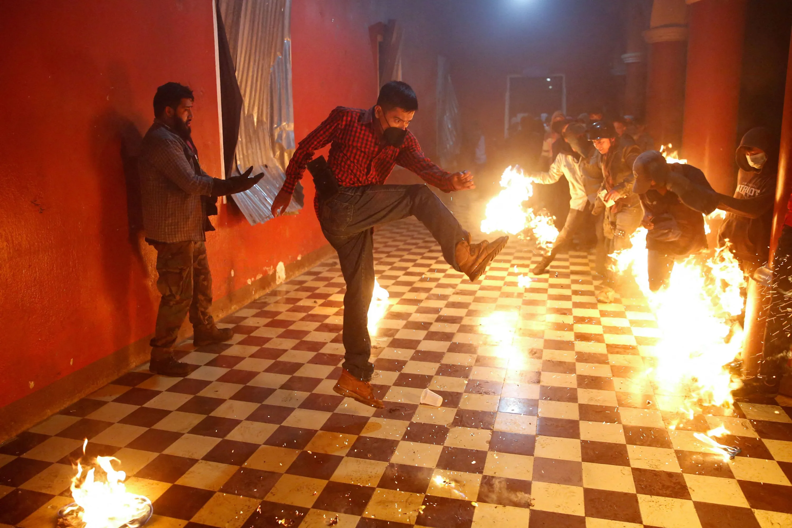 People kick flaming balls at each other during the “Flaming balls” festival as part of the yearly commemoration of the Immaculate Conception of the Virgin Mary, at the central plaza in San Cristobal Verapaz, Guatemala on December 8, 2021. (Photo by Luis Echeverria/Reuters)