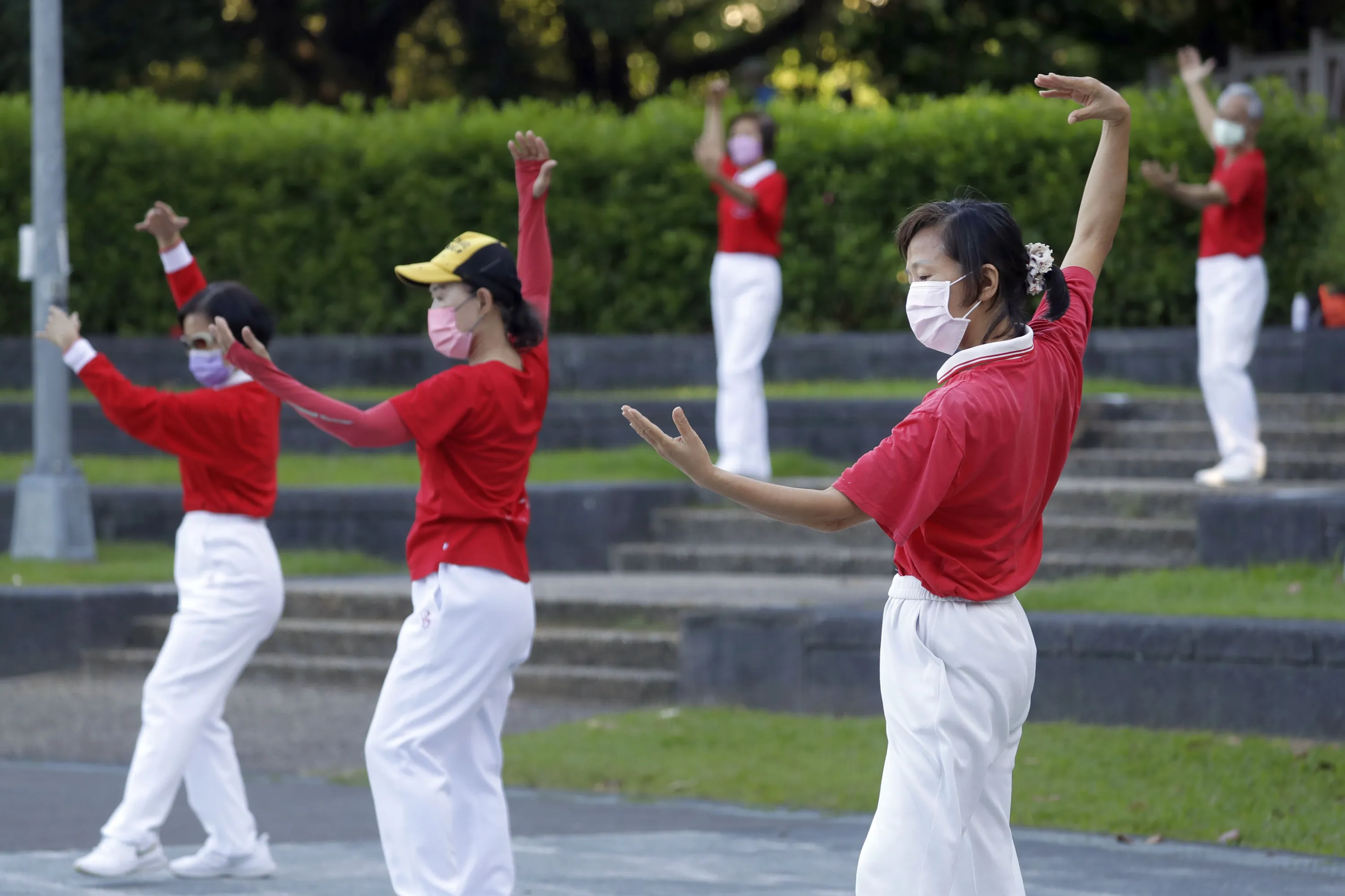People wearing face masks to protect against the spread of the coronavirus take morning exercises at a park in Taipei, Taiwan, Wednesday, September 28, 2022. (Photo by Chiang Ying-ying/AP Photo)