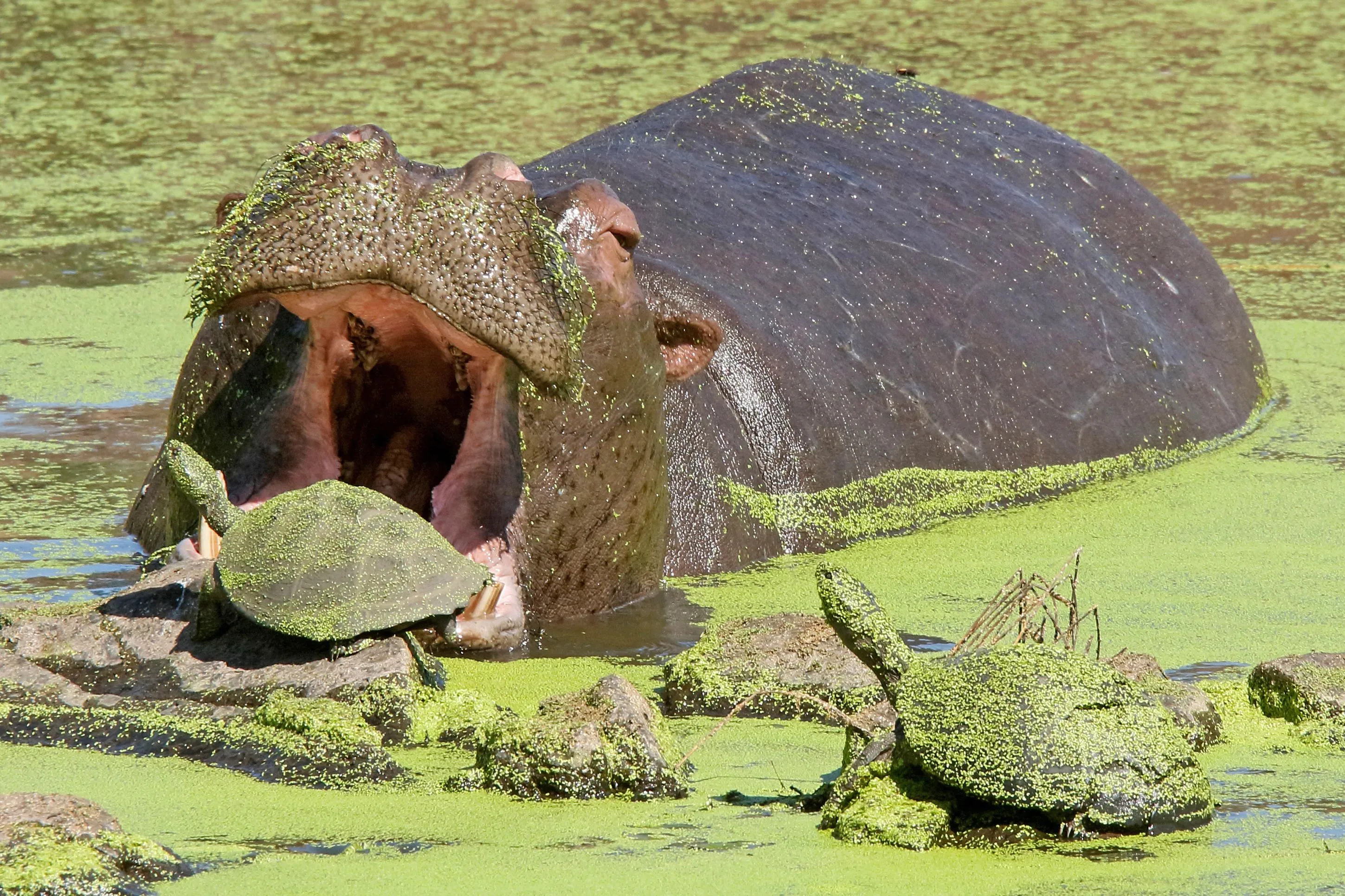 A hippo gives some terrapin's a scare as it shows off it's powerful jaws in the Kruger National Park, South Africa in September 2022. (Photo by Jean Jacques Alcalay/Naturagency/Solent News & Photo Agency)