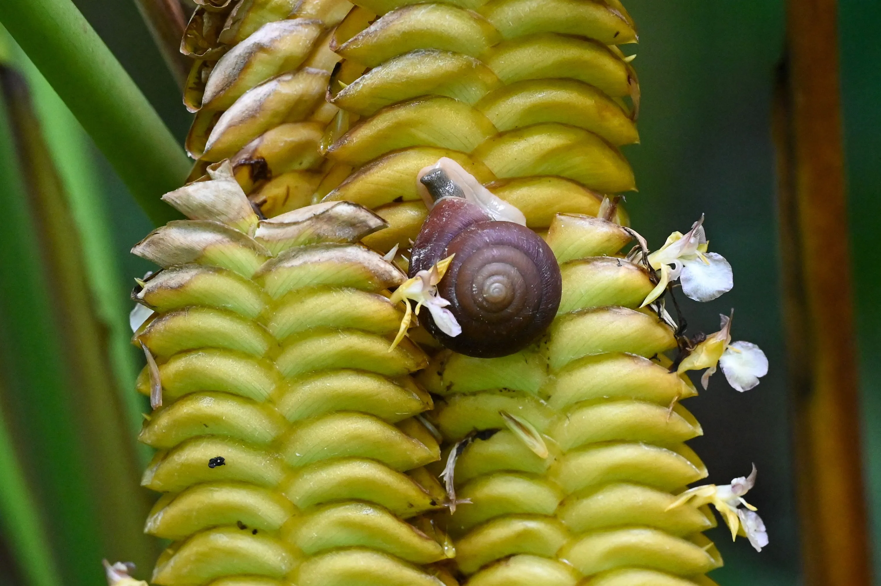 A snail crawls on flower buds at the Gardens by the Bay in Singapore on September 20, 2022. (Photo by Roslan Rahman/AFP Photo)