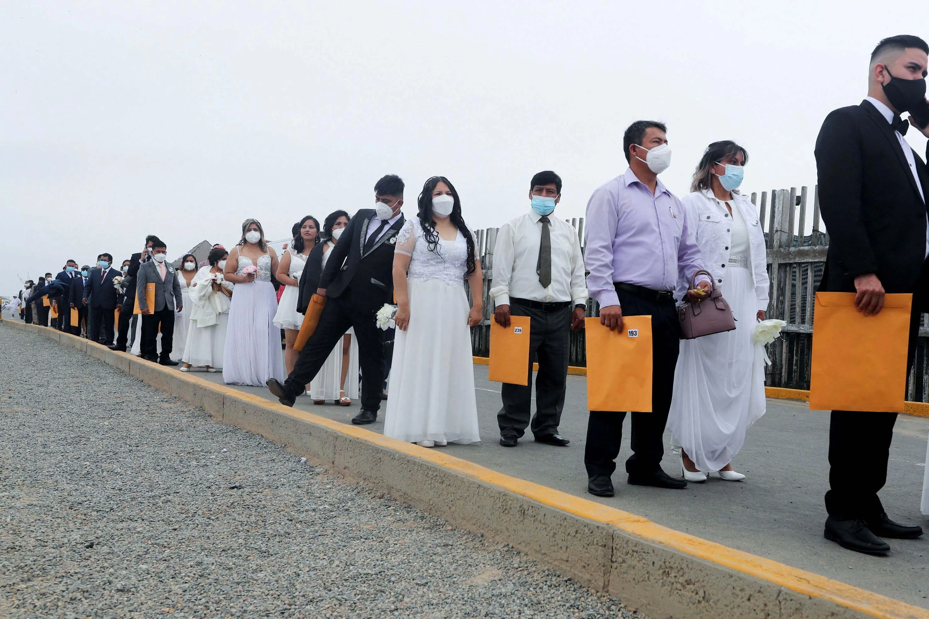 Couples stand in line before getting married in a mass wedding ceremony on the beach, in Lima, Peru on December 11, 2021. (Photo by Sebastian Castaneda/Reuters)