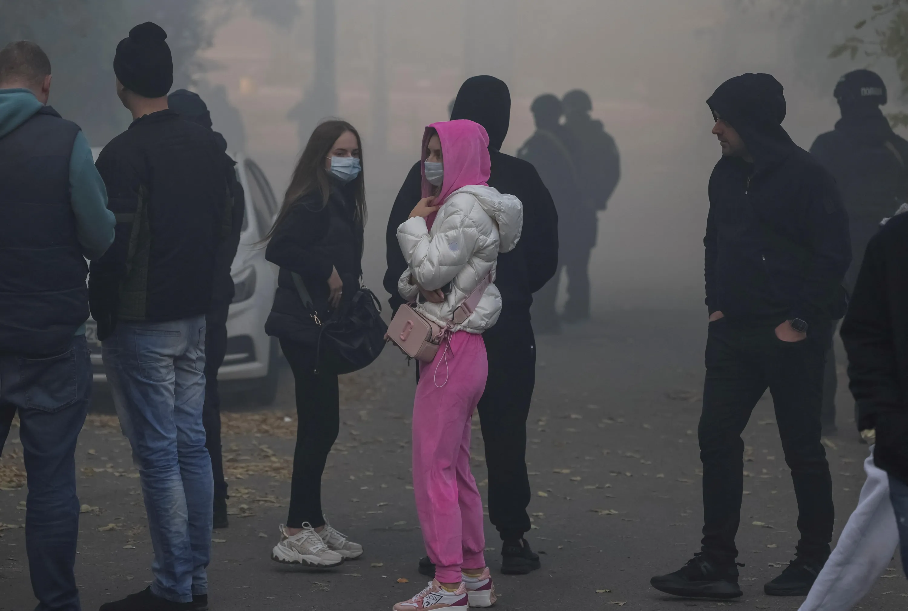 Local residents look on as smoke rises after a Russian drones strike, which local authorities consider to be Iranian made unmanned aerial vehicles (UAVs) Shahed-136, amid Russia's attack on Ukraine, in Kyiv, Ukraine on October 17, 2022. (Photo by Gleb Garanich/Reuters)
