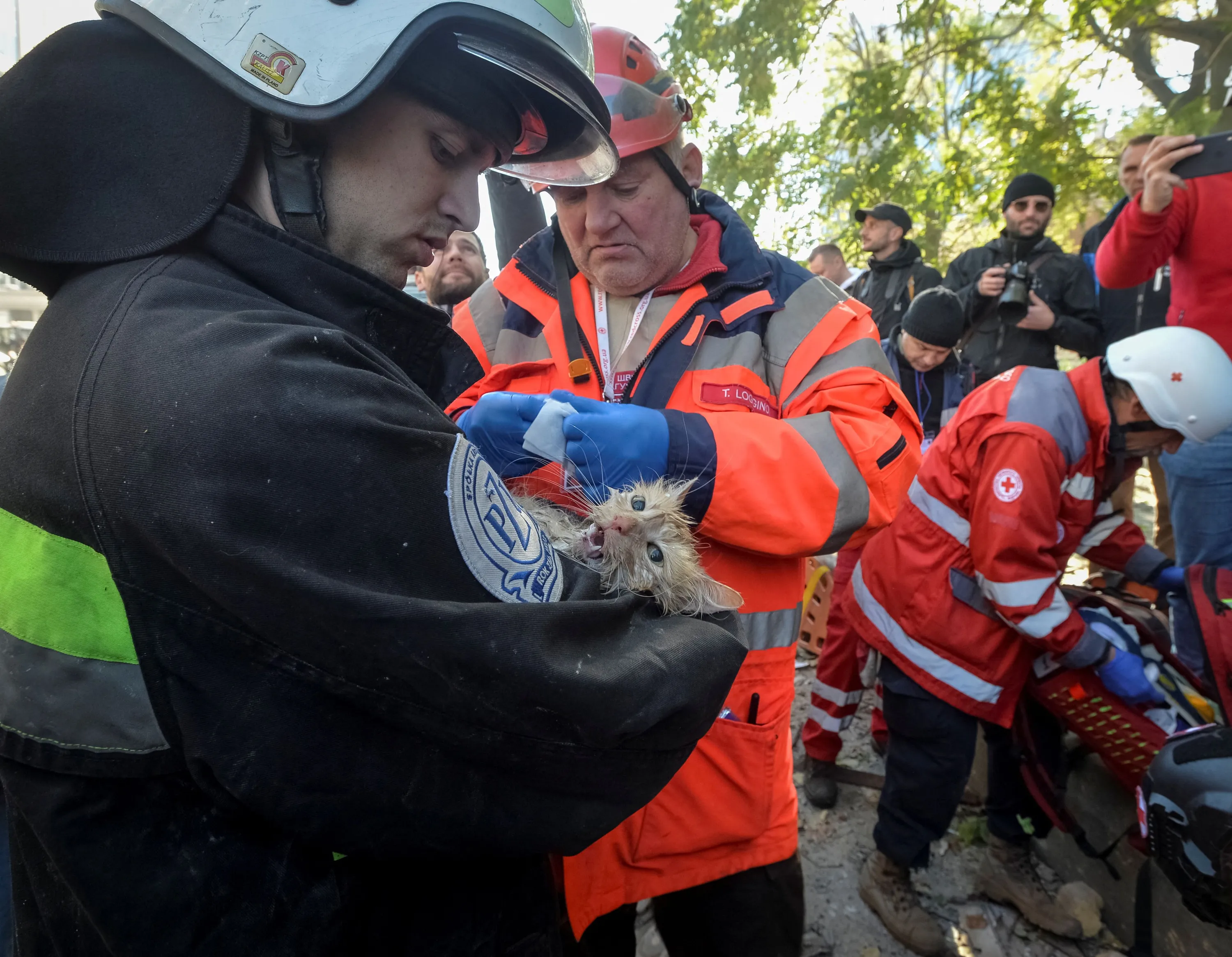 Rescuers help a cat that was rescued from a residential building destroyed by a Russian drone strike, which local authorities consider to be Iranian-made unmanned aerial vehicles (UAVs) Shahed-136, amid Russia's attack on Ukraine, in Kyiv, Ukraine on October 17, 2022. (Photo by Oleksandr Klymenko/Reuters)