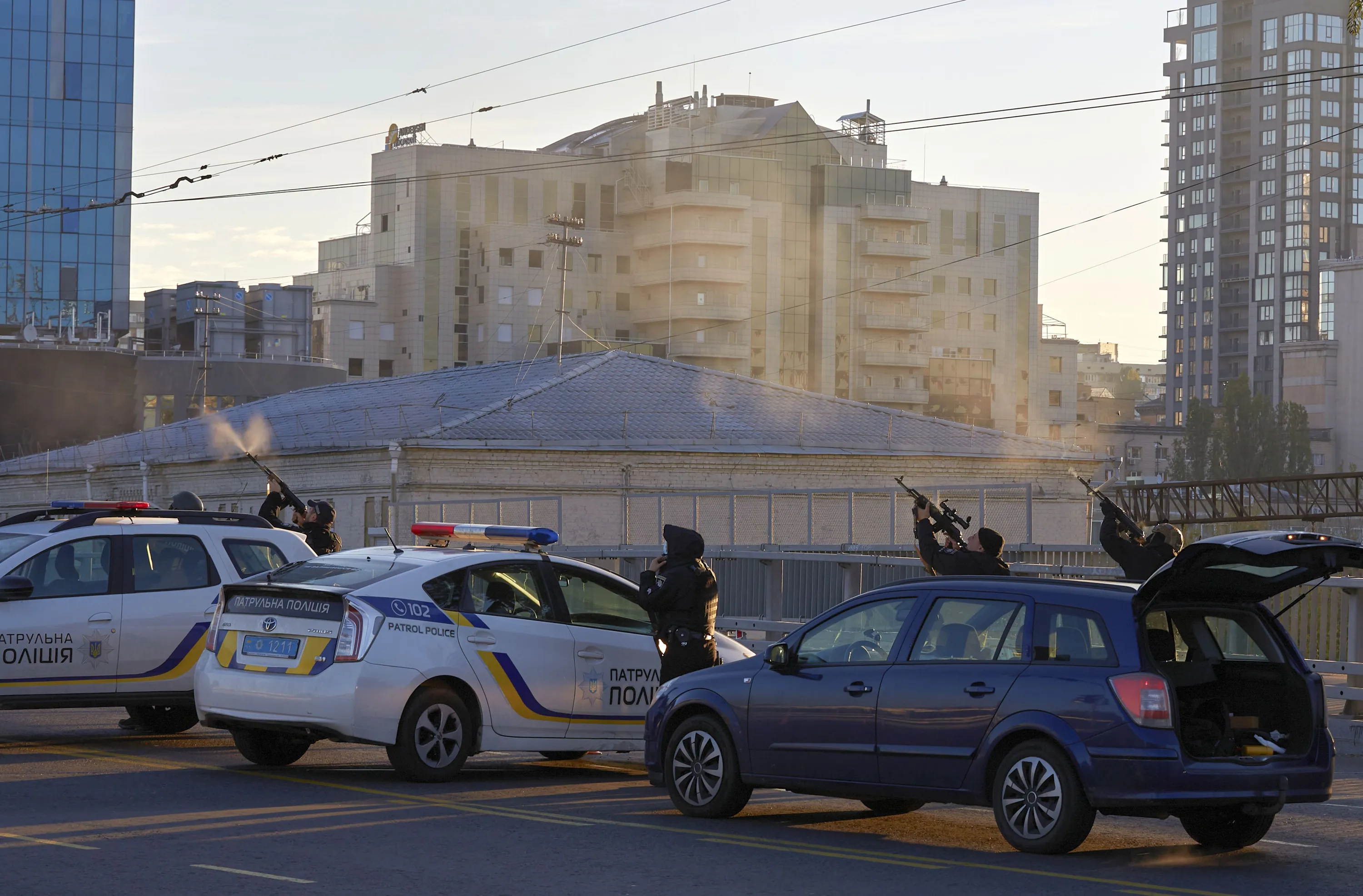 Ukrainian soldiers shoot a drone that appears in the sky seconds before it fired on buildings in Kyiv, Ukraine, Monday, October 17, 2022. (Photo by Vadym Sarakhan/AP Photo)