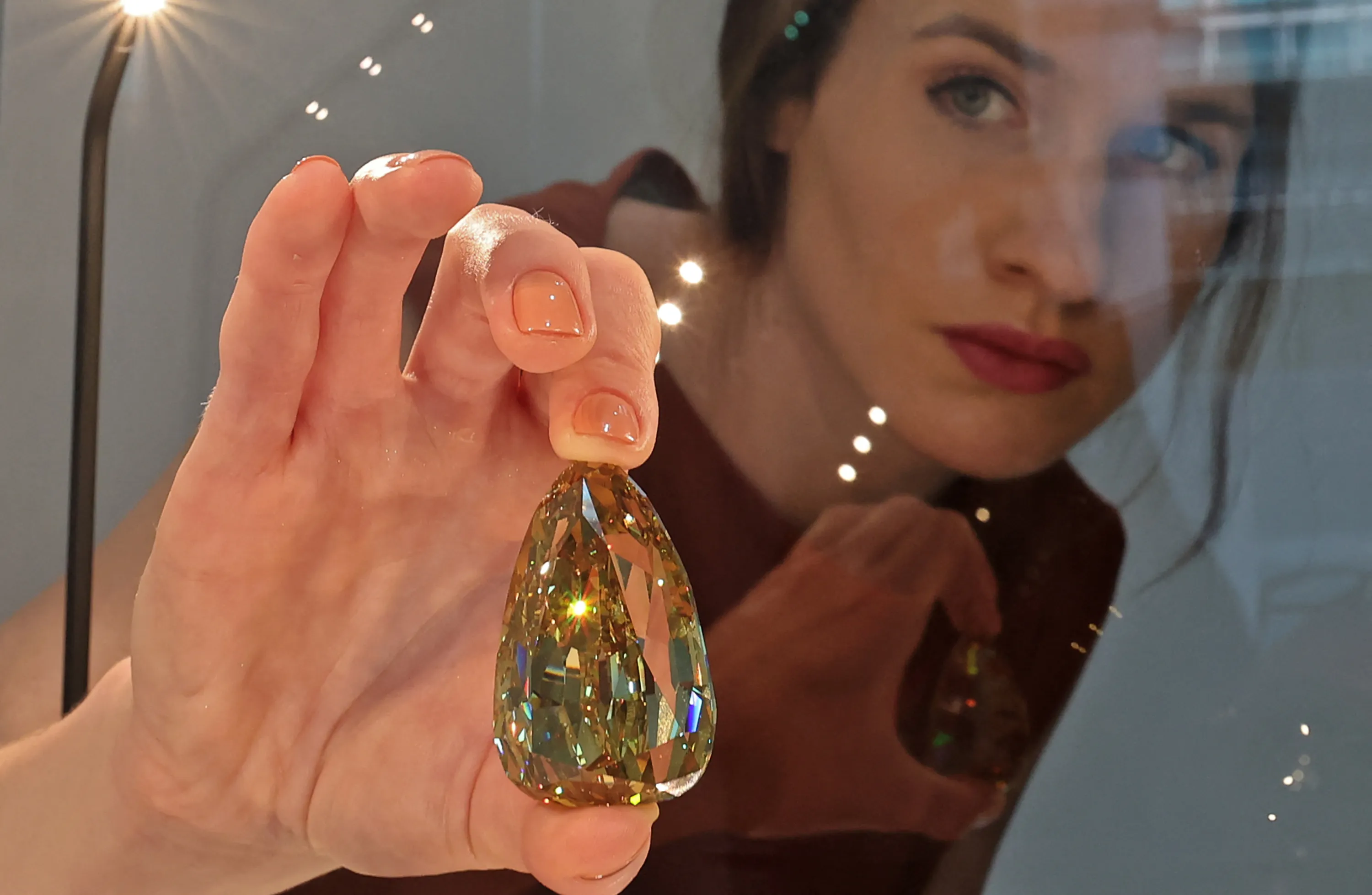 An employee picks up the “Golden Canary” brownish-yellow coloured diamond, weighing 303.10 carats, at Sotheby's in the Gulf emirate of Dubai on October 17, 2022. (Photo by Giuseppe Cacace/AFP Photo)