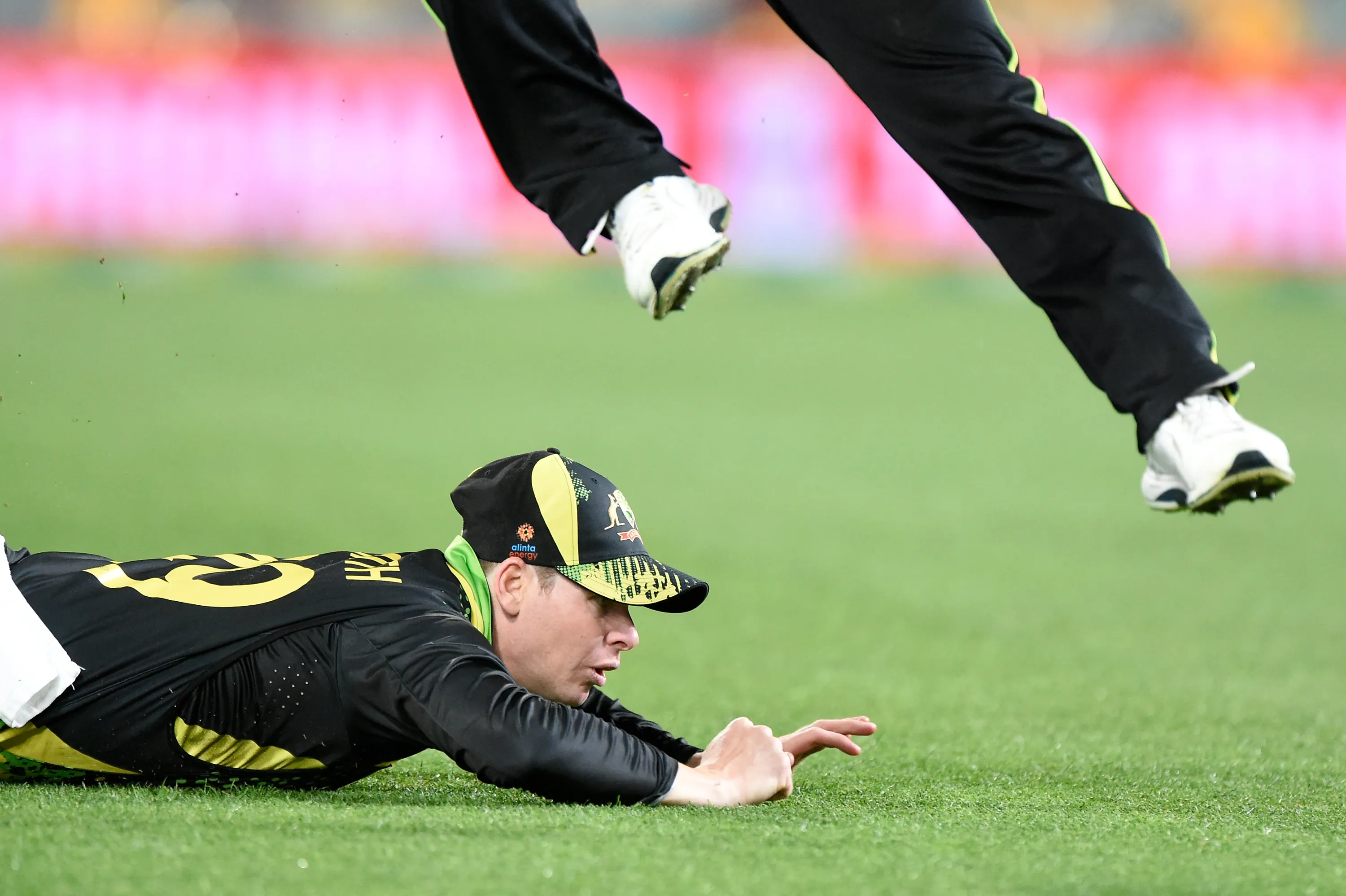 Steve Smith of Australia dives for a catch during game two of the T20 International Series between Australia and the West Indies at The Gabba on October 07, 2022 in Brisbane, Australia. (Photo by Matt Roberts/Getty Images)