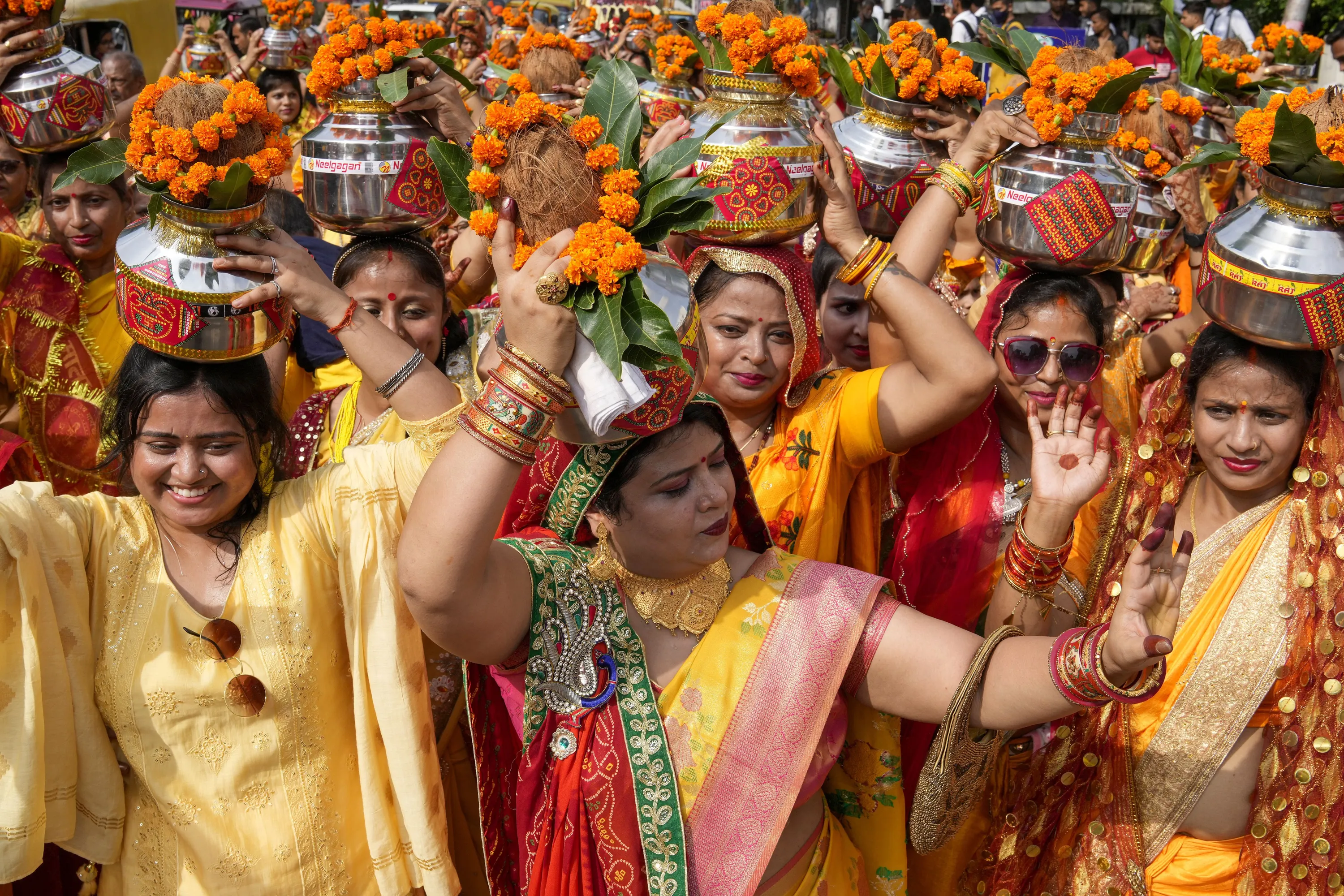 Hindu women carry water from River Ganges on their heads and walk in a procession as they perform a ritual in Prayagraj, northern Uttar Pradesh state, India, Monday, October 10, 2022. (Photo by Rajesh Kumar Singh/AP Photo)
