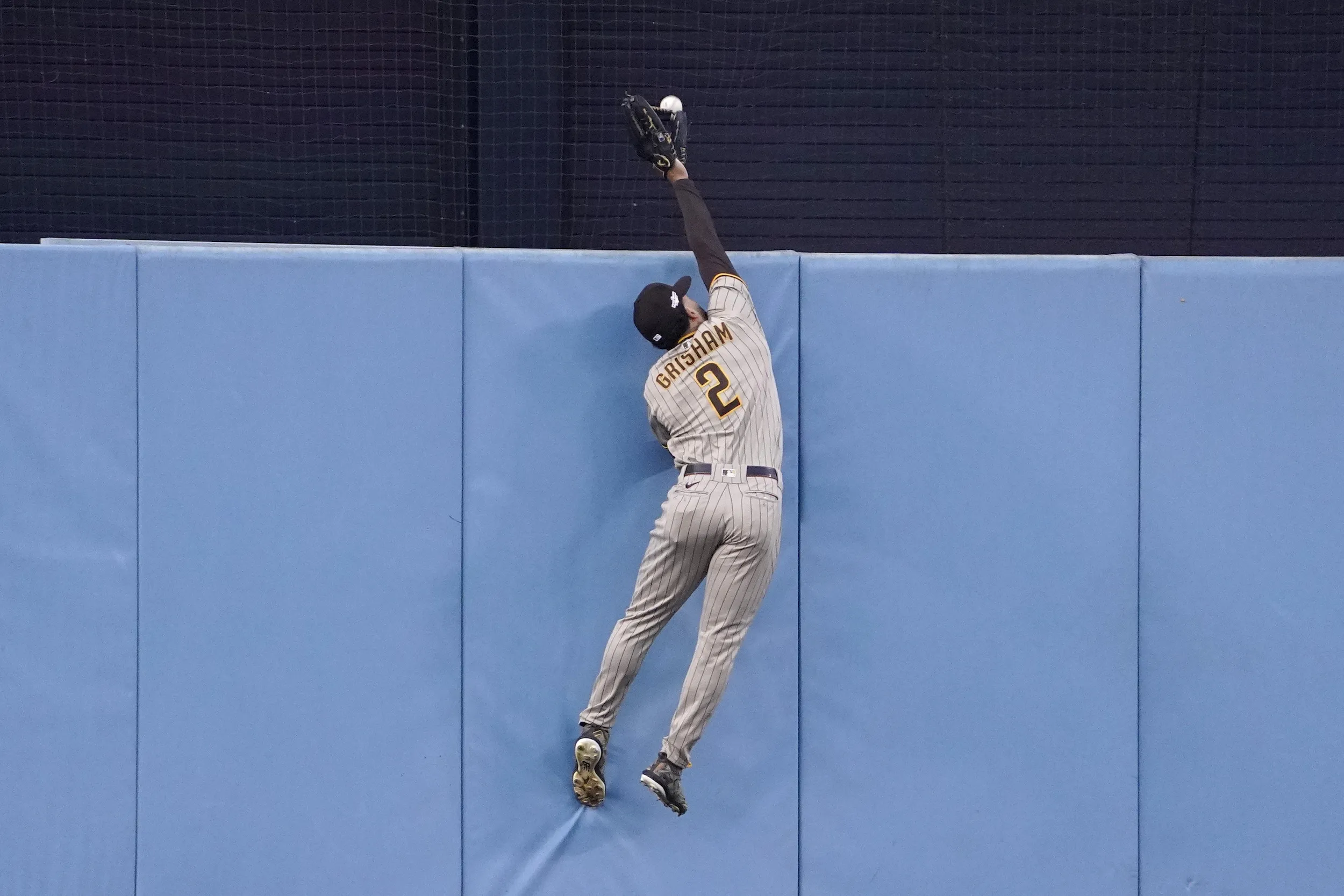 San Diego Padres center fielder Trent Grisham leaps for but cannot catch a solo home run by Los Angeles Dodgers' Freddie Freeman during the first inning in Game 2 of a baseball NL Division Series, Wednesday, Oct. 12, 2022, in Los Angeles. (AP Photo/Mark J. Terrill)