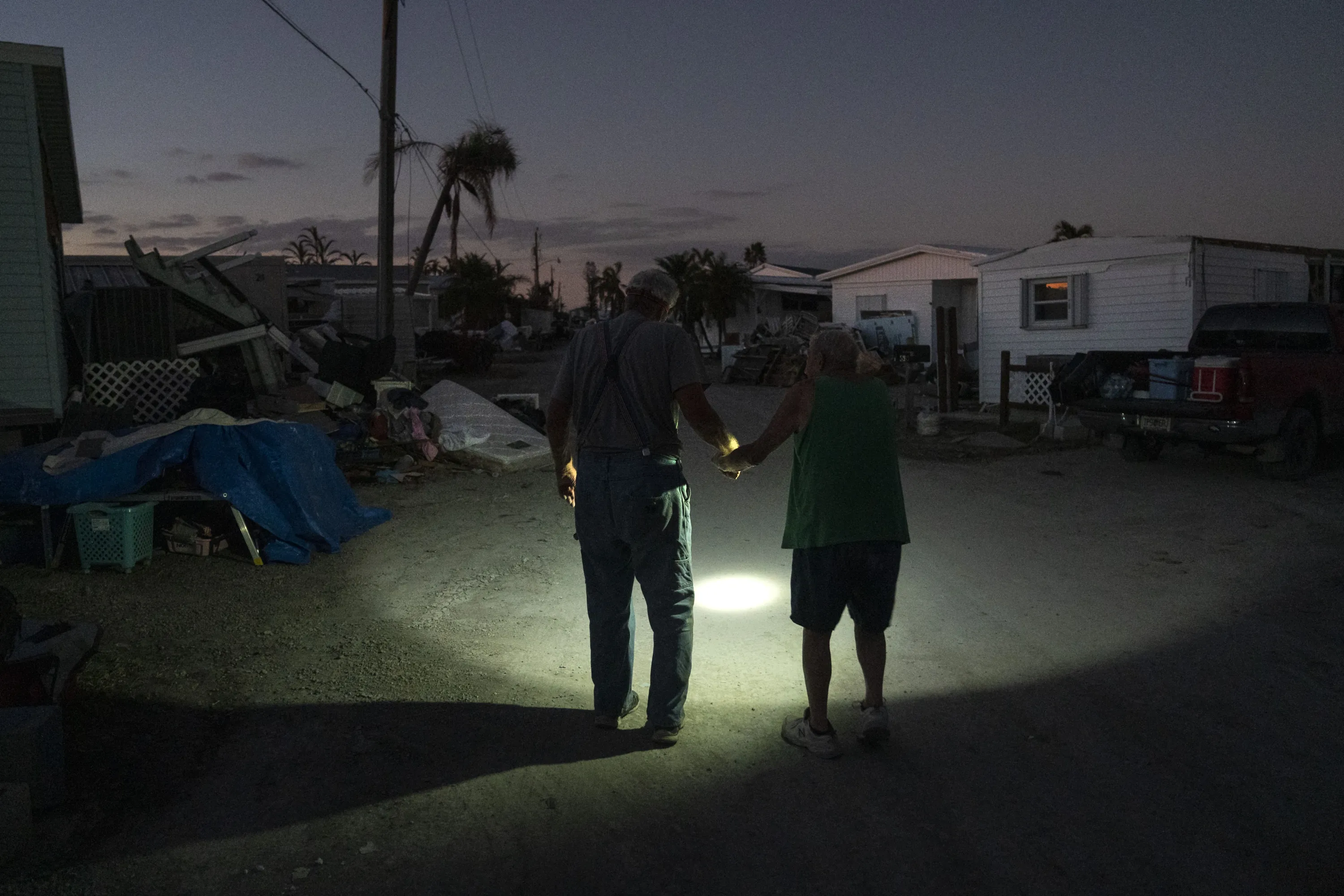 Charlie Whitehead, left, helps his 84-year-old neighbor Leslie Pickett down the street of their mobile home community on October 7, 2022 in San Carlos Island, Florida. Pickett, who suffers from dementia, and his wife, Pat, 83, weathered Hurricane Ian in their mobile home, which was flooded by the storm surge and left them floating inside. Whitehead, who describes himself as a lost son of theirs, has been helping them and has erected a tent where they now sleep. The electricity in their neighborhood, one of the hardest hit by Ian, has been out since the storm over a week ago. (Photo by Michael Robinson Chavez/The Washington Post)