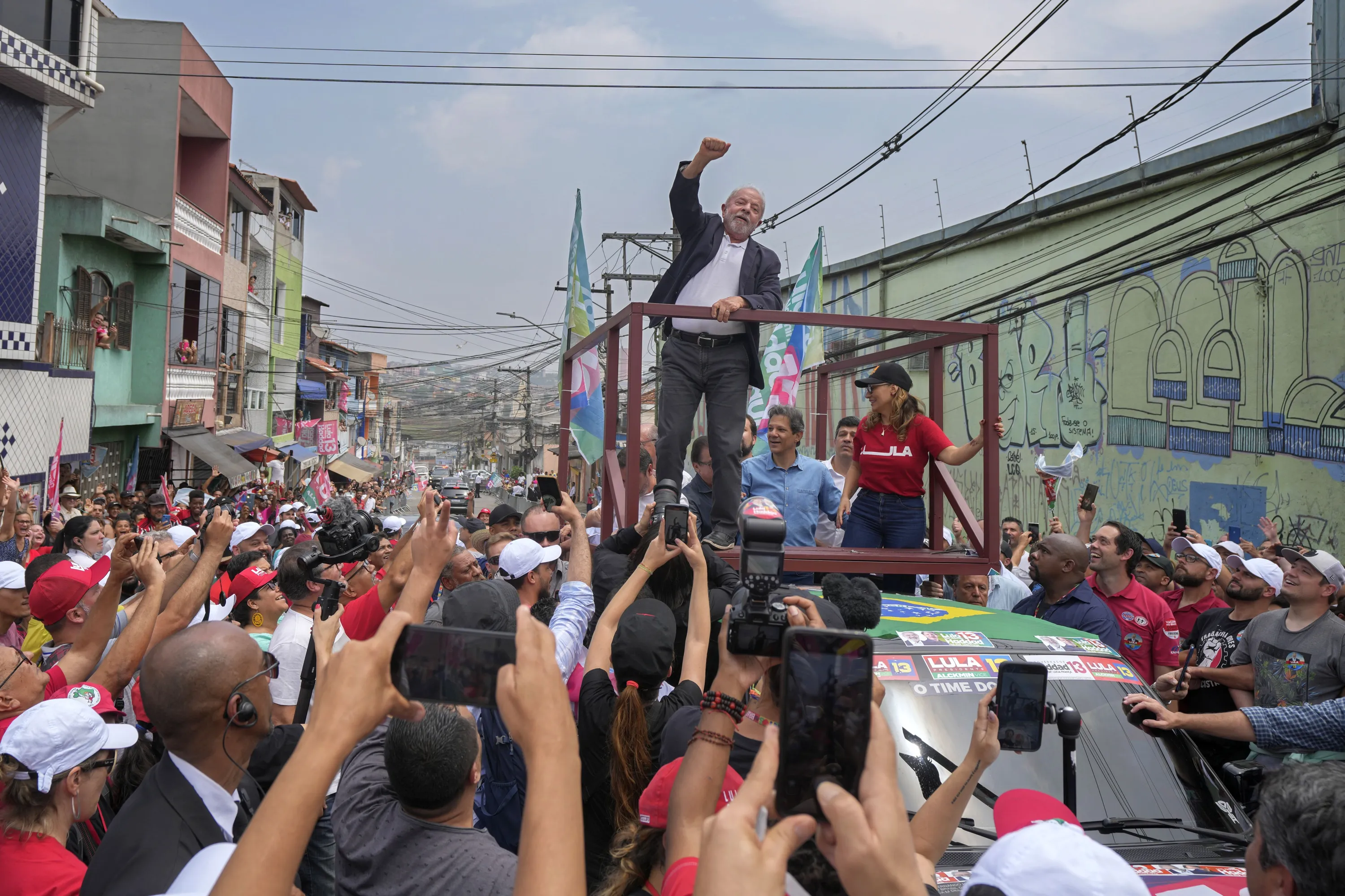 Former Brazilian President Luiz Inacio Lula da Silva waves during a campaign rally as he runs for the presidency again, alongside his running-mate Geraldo Alckmin, in Sao Paulo, Brazil, Monday, October 17, 2022, as seen from inside a parked bus. The presidential runoff election is set for Oct. 30. (Photo by Andre Penner/AP Photo)