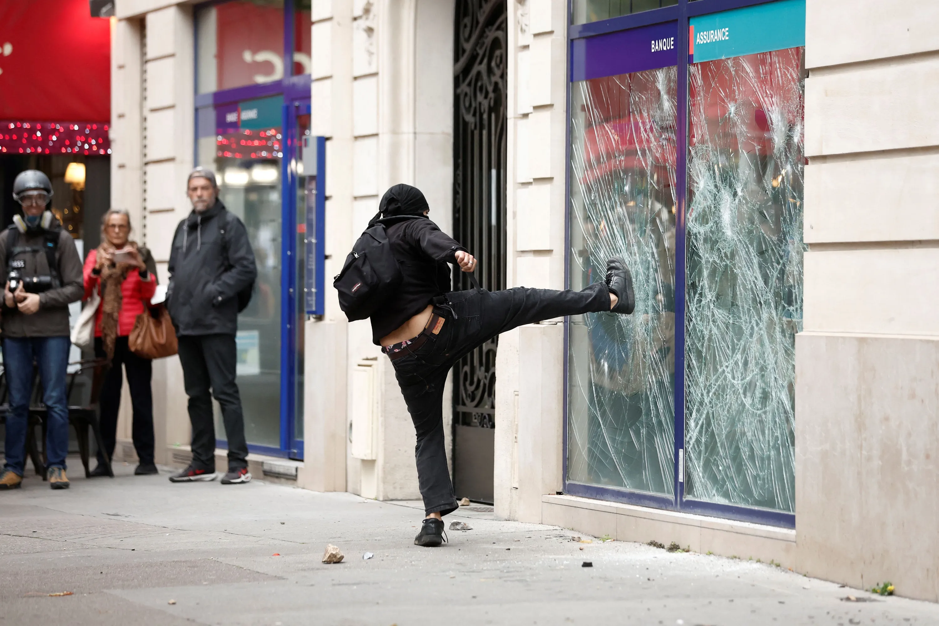 A demonstrator destroys a bank window during clashes at a demonstration in Paris as part of a nationwide day of strike and protests for higher wages and against requisitions at refineries in France on October 18, 2022. (Photo by Benoit Tessier/Reuters)