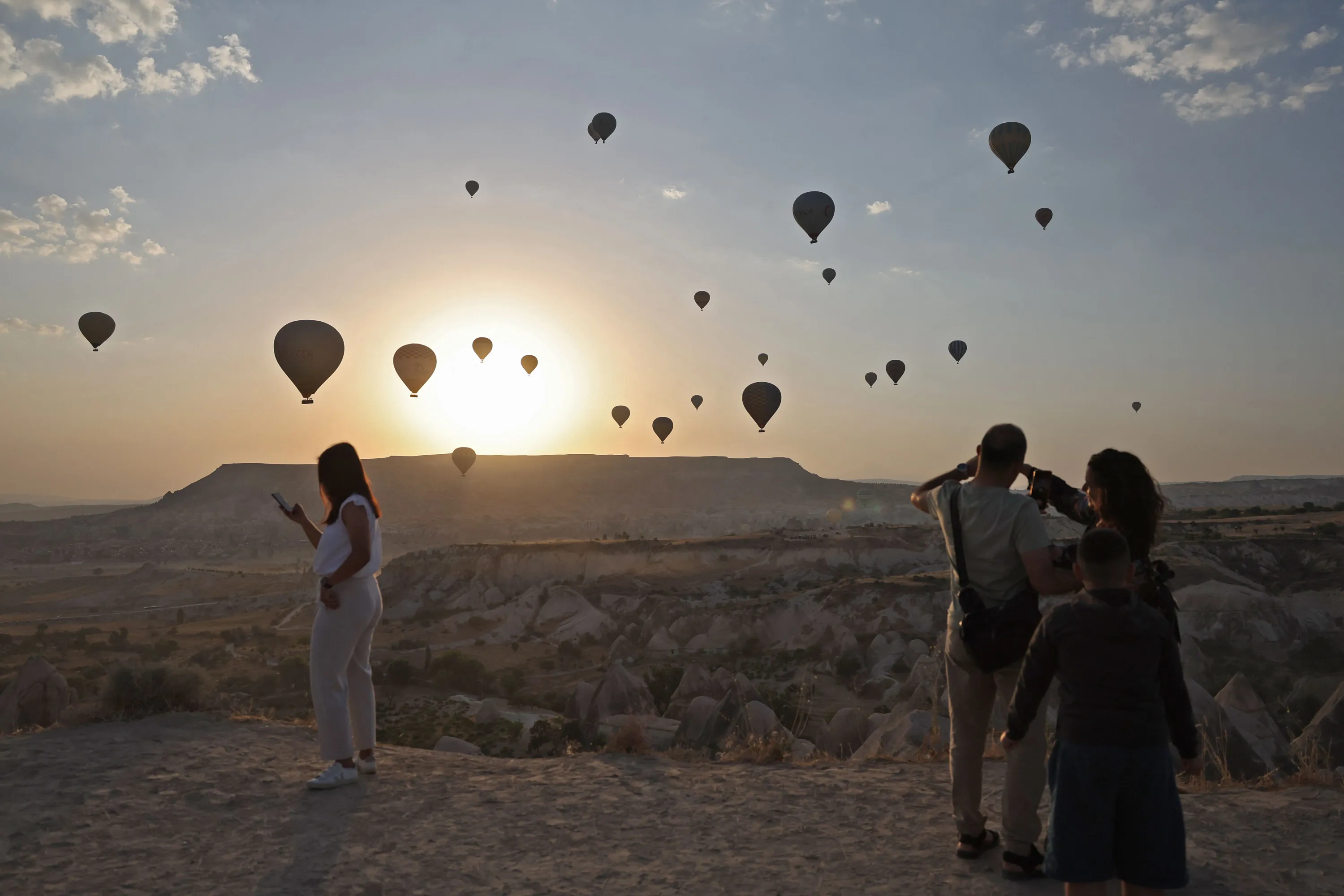 People watch as sight-seeing hot air balloons launch in Goreme Historical National Park, east of Nevesehir (Neapolis) in the province of the same name in central Turkey's historical Cappadocia (Kapadokya) region on August 24, 2022. (Photo by Omar Haj Kadour/AFP Photo)