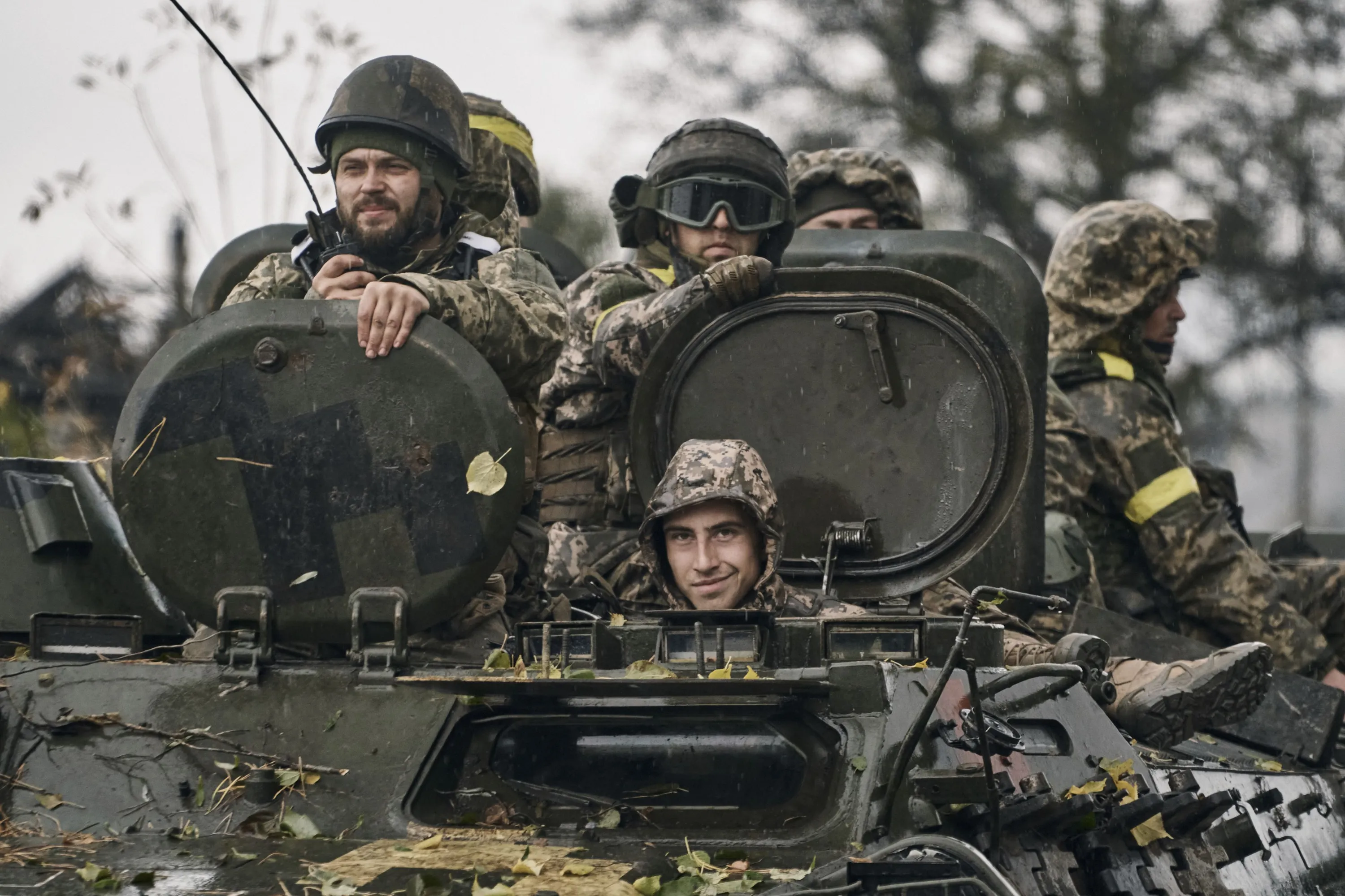Ukrainian soldiers ride an APC in Donetsk region, Ukraine, Thursday, October 20, 2022. (Photo by LIBKOS/AP Photo)