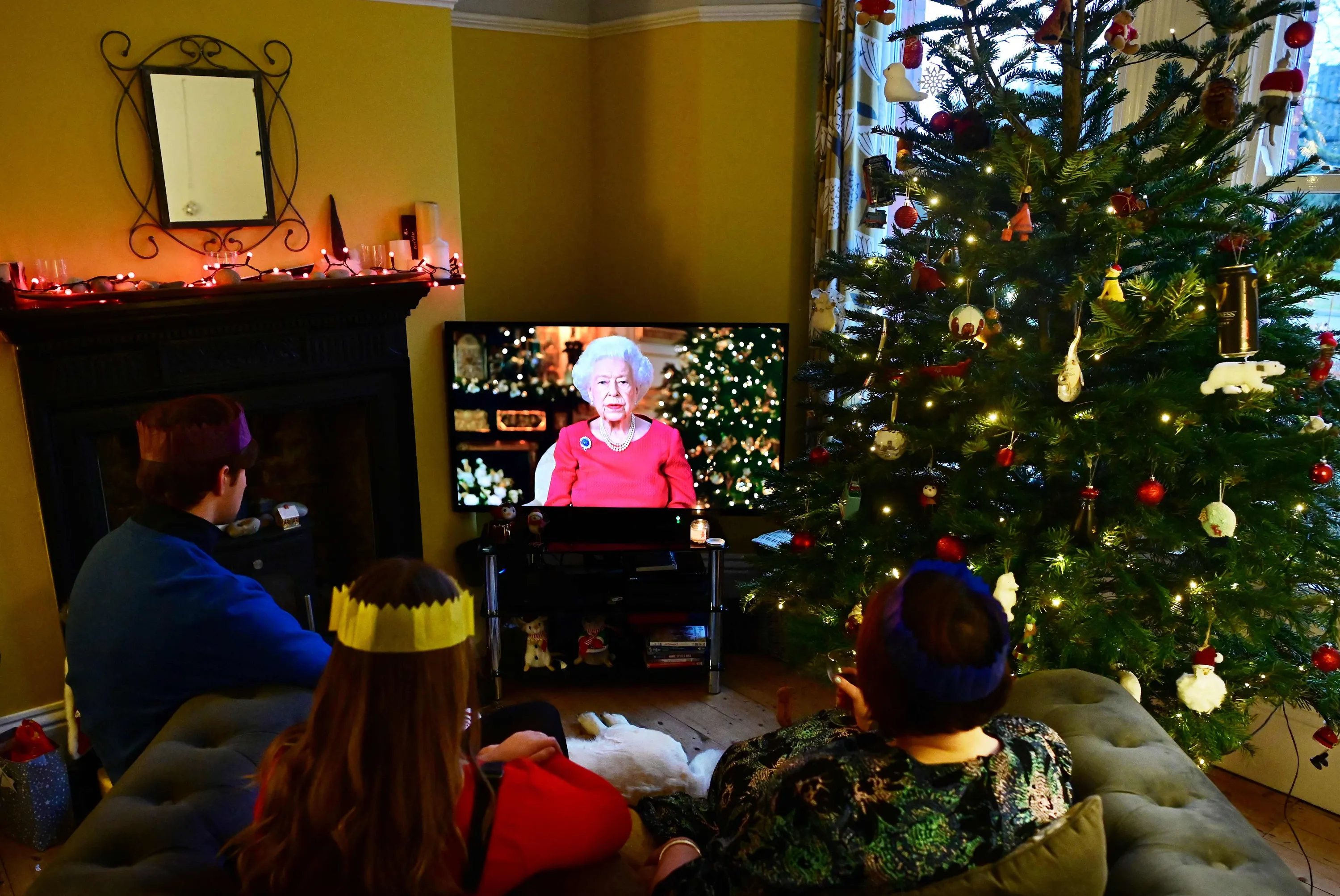 A family watch as Britain's Queen Elizabeth II delivers her annual Christmas Broadcast message, at their home near Liverpool on December 25, 2021. Queen Elizabeth II paid a touching tribute to her late husband Prince Philip in her Christmas Day message as she marked the holiday with a family gathering. (Photo by Paul Ellis/AFP Photo)