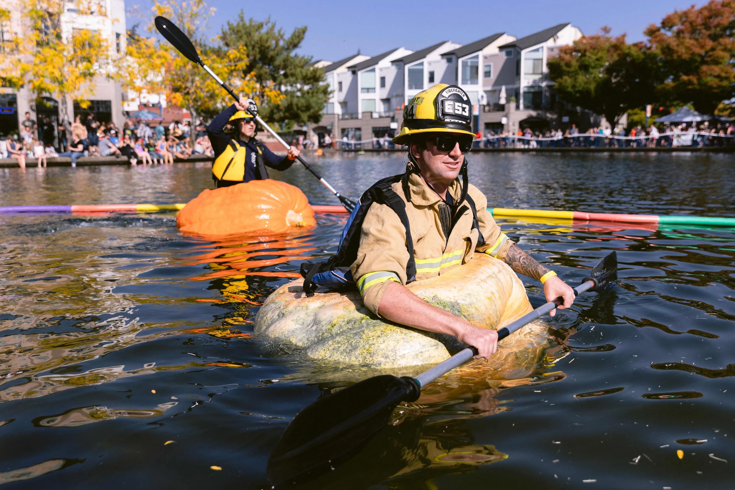 Garret Cox, of Tualatin Valley Fire & Rescue, prepares to paddle in the first responder race during the West Coast Giant Pumpkin Regatta in Tualatin, Oregon, on October 16, 2022. Since 2004, costumed characters in giant pumpkins compete in a series of races in Tualatin Lake. (Photo by Wesley Lapointe/AFP Photo)