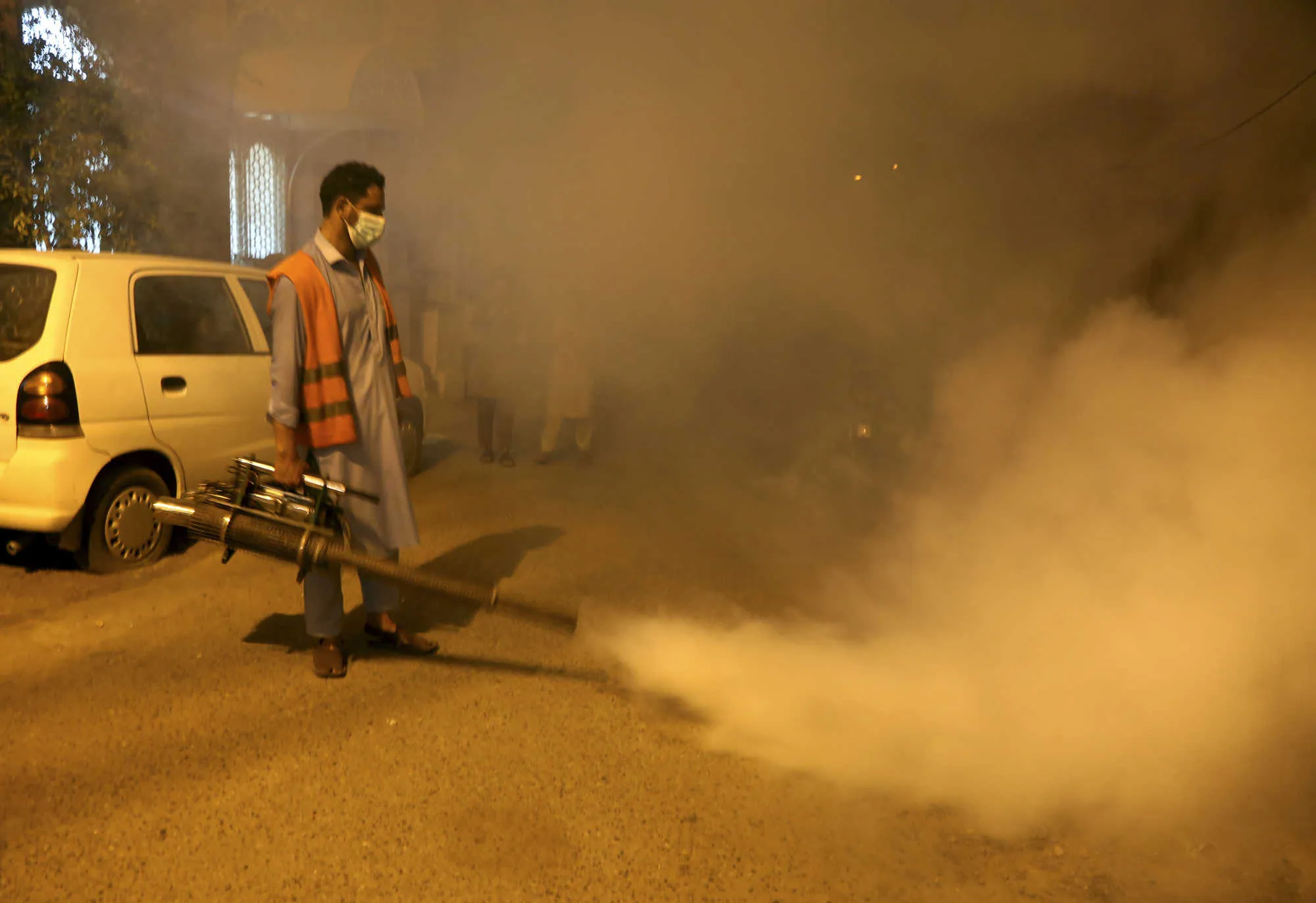 Pakistani health workers fumigate to kill mosquitos in an effort to prevent an outbreak of dengue fever, in Peshawar, Pakistan. Friday, September 23, 2022. Pakistan has deployed thousands of additional doctors and paramedics in the country's worst flood-hit province to contain the spread of diseases that have killed over 300 people among the flood victims, officials said Friday. (Photo by Muhammad Sajjad/AP Photo)